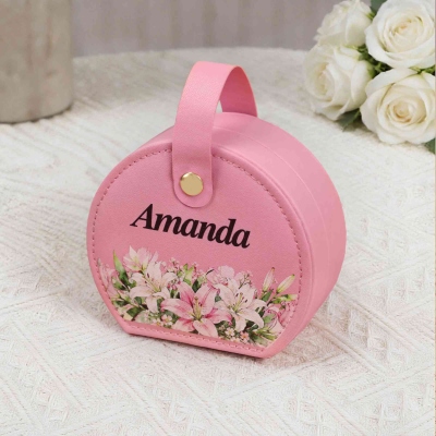 Diseño floral personalizado : El estuche luce un estilo delicado y femenino con un estampado floral de acuarela en la base, complementado con un nombre personalizado en una elegante caligrafía. La combinación de delicadas flores y líneas limpias y modernas crea un joyero elegante y con un toque de significado, ideal para mujeres que aprecian la elegancia y el orden.