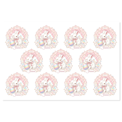 Conejito Fantasioso y Huevo Arcoíris : Estas adorables pegatinas presentan una suave ilustración vintage de un conejito blanco sosteniendo un huevo arcoíris en tonos pastel, enmarcado por delicados remolinos florales y bordes con efecto encaje. Cada pegatina está disponible en suaves tonos azul o rosa, creando un look dulce y atemporal, perfecto para la decoración de Pascua.