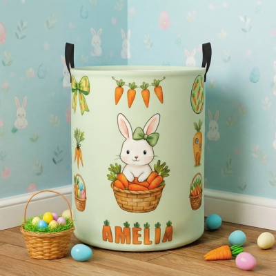 Cesta de almacenamiento de zanahoria y conejo : Una alegre cesta de almacenamiento primaveral con un adorable conejito y una zanahoria. Su diseño divertido con zanahorias, cestas y detalles verdes llena de alegría la habitación de cualquier niño.