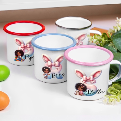 | Estilo | Taza de esmalte con nombre personalizado, diseño de niña negra con orejas de conejo y lazo, alfabeto |