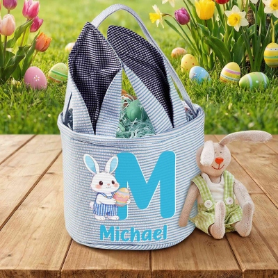 | Estilo | Canasta de Pascua con nombre personalizado, conejito de dibujos animados y huevo colorido con orejas de conejo |