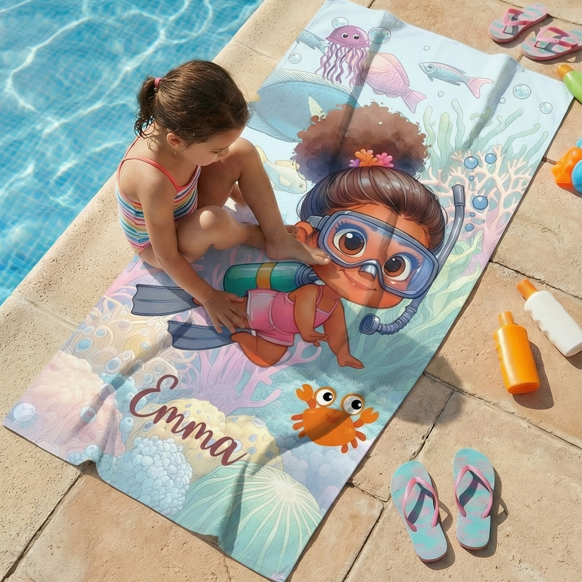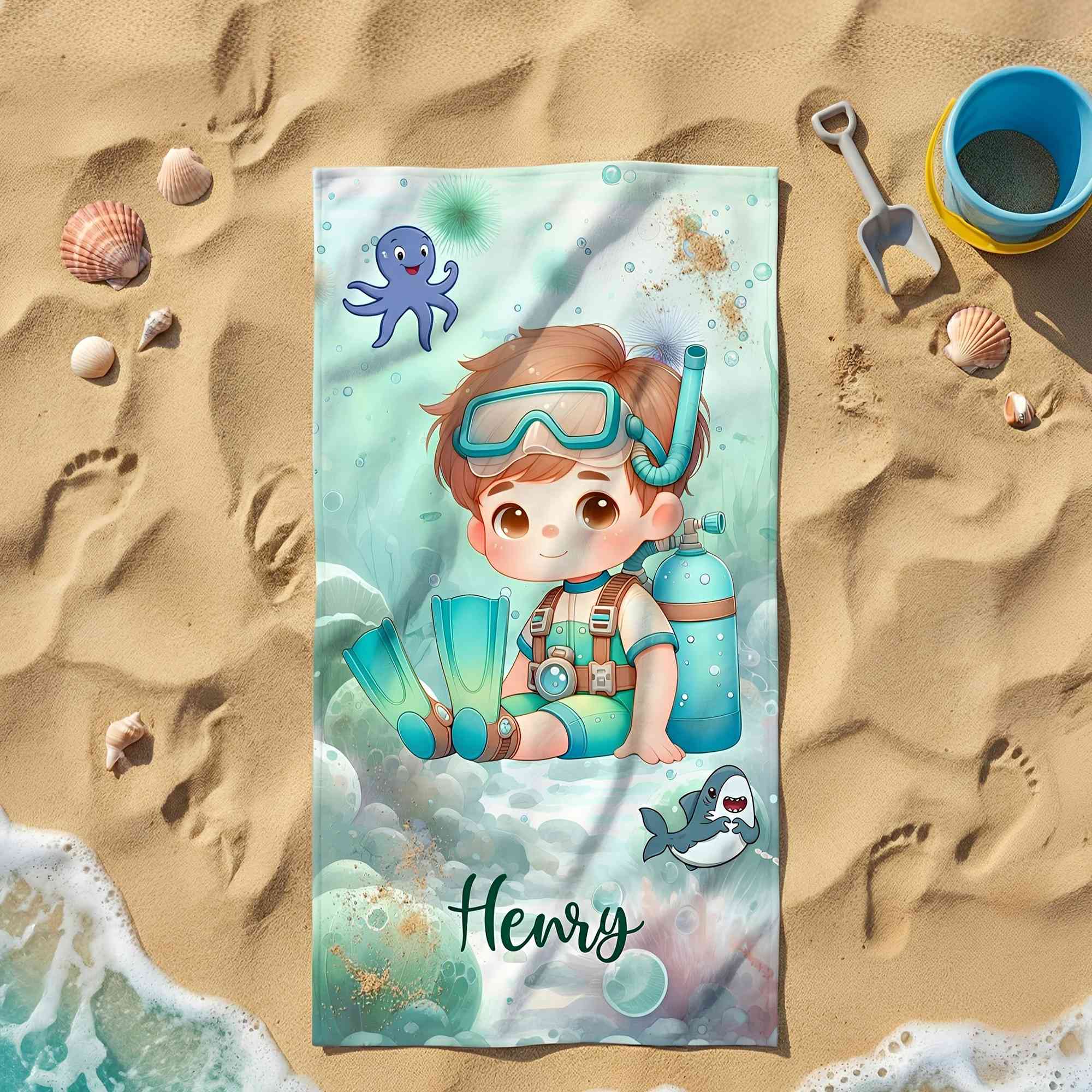 Diseño personalizado de personajes de buceo : esta toalla de playa incluye una selección de dibujos animados de buceadores, tanto niños como niñas, junto con simpáticos animales marinos como pulpos, tiburones y estrellas de mar, creando una temática de aventura oceánica que encantará a los niños. Puedes personalizarla con el nombre de tu hijo/a, convirtiéndola en un recuerdo especial del verano.