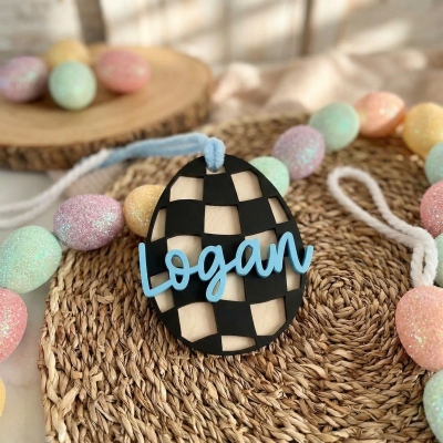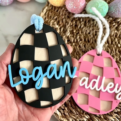 Etiqueta para Huevos a Cuadros : Una divertida etiqueta con forma de huevo, con un clásico patrón de tablero de ajedrez y un nombre personalizado en negrita. Perfecta para canastas de Pascua, búsquedas de huevos o decoración primaveral.