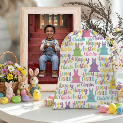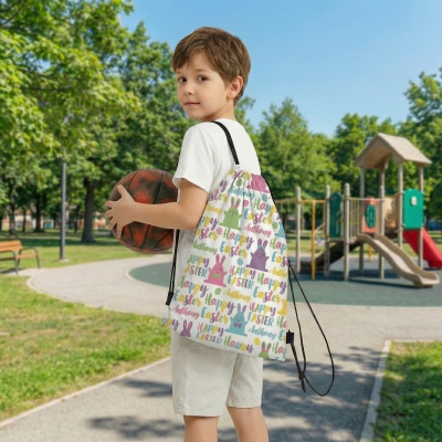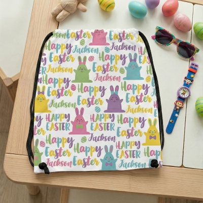 | Estilo | Mochila con cordón de conejito colorido con nombre personalizado Feliz Pascua |