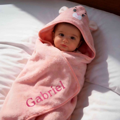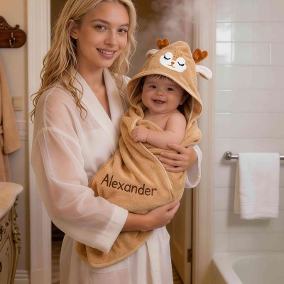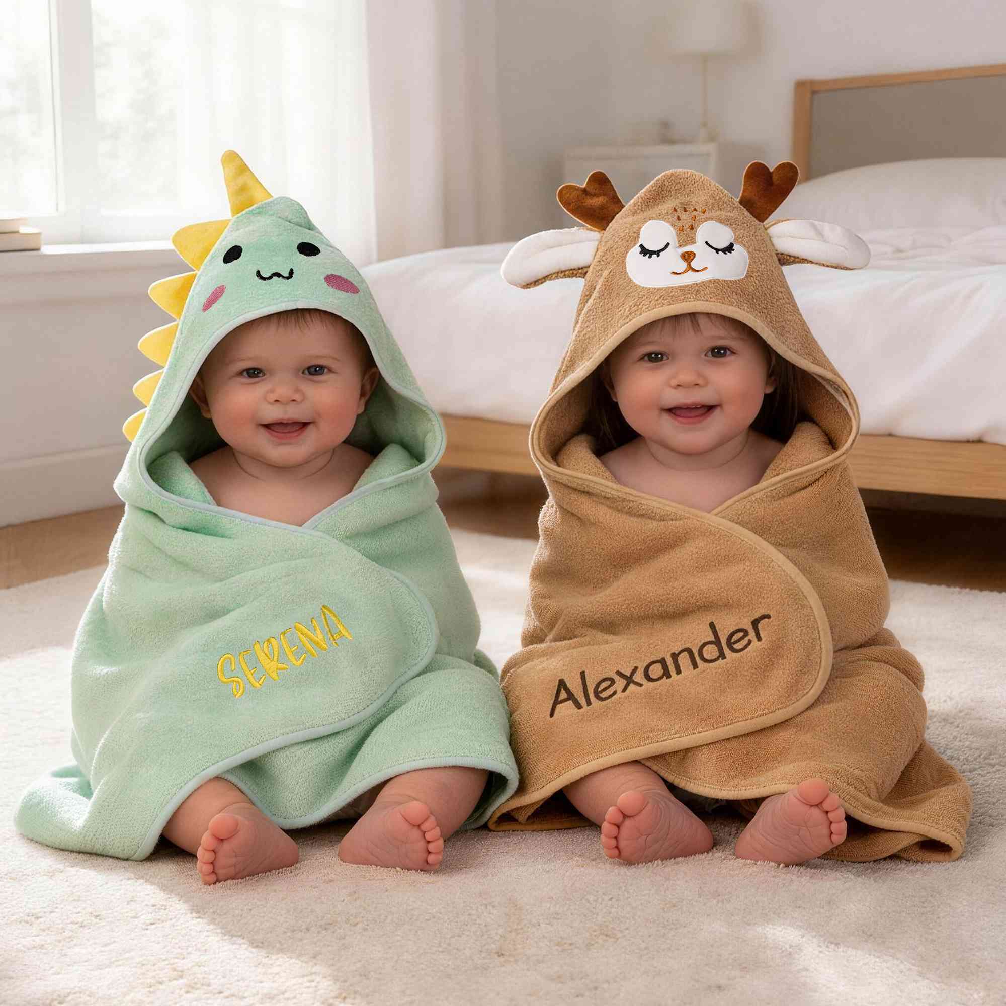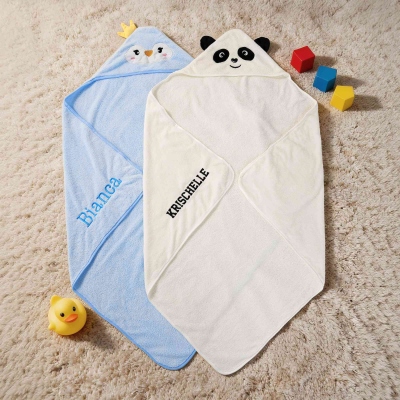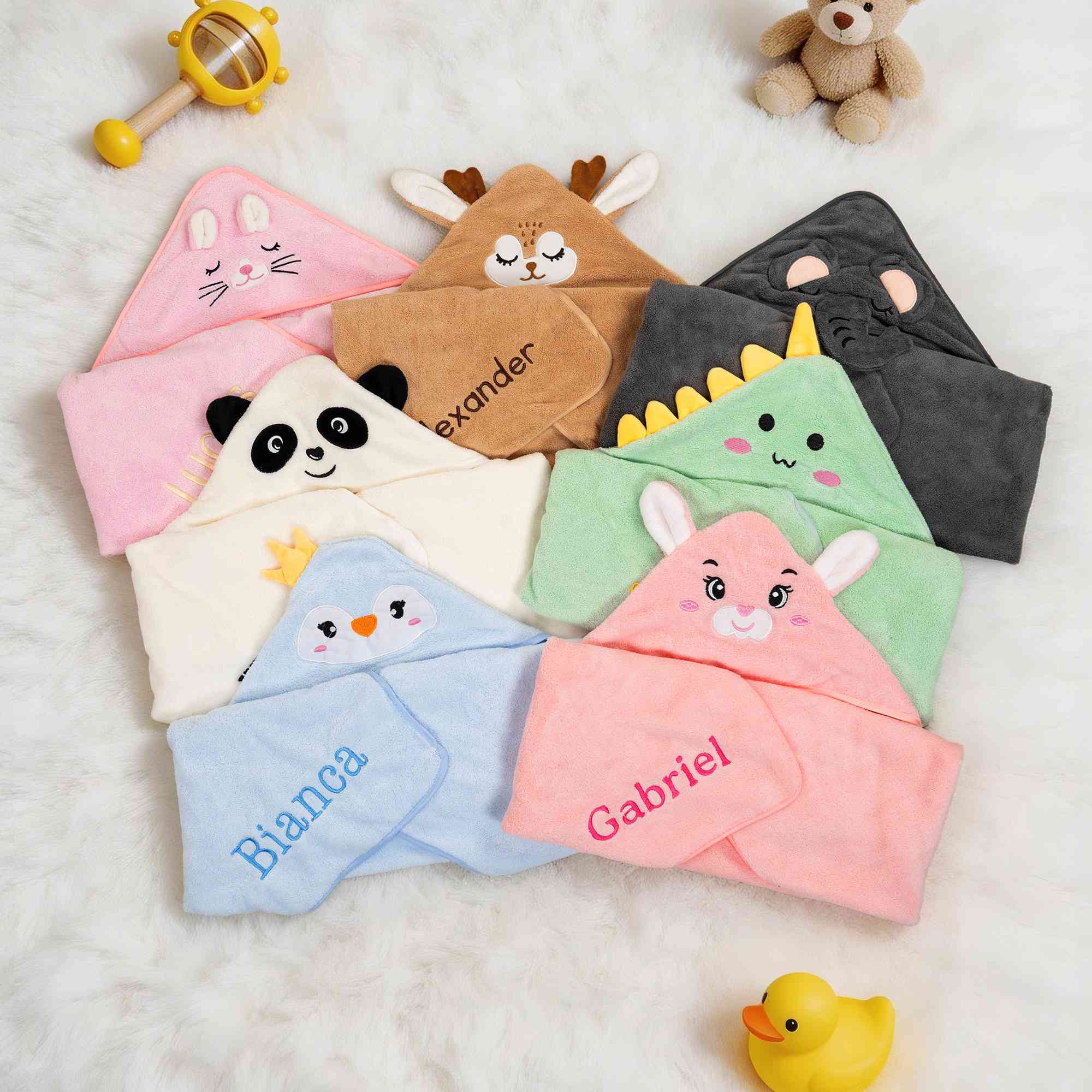 Toalla de baño con capucha y diseño de animales adorables : esta toalla tiene una encantadora capucha con motivos de animales que le da un aspecto tierno y acogedor. Con una selección de diseños de animales populares, resalta el dulce y adorable encanto de tu bebé. Personalizarla con su nombre le da un toque especial, convirtiendo la toalla en un recuerdo único, tierno y reconfortante.