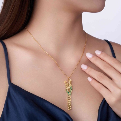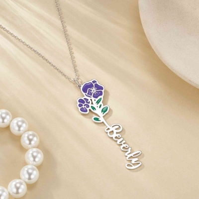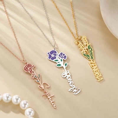 Toque personalizado : Puedes añadir un nombre junto con la flor de nacimiento elegida al colgante, creando un recuerdo verdaderamente personal. El nombre se integra perfectamente debajo de la flor, dándole al collar un toque sentimental y único.