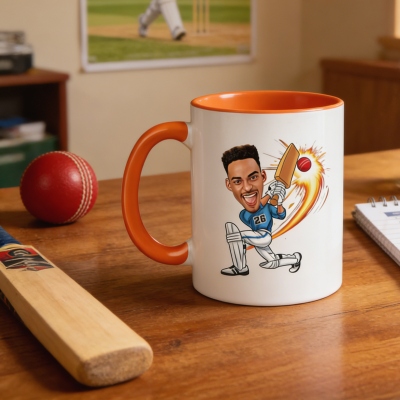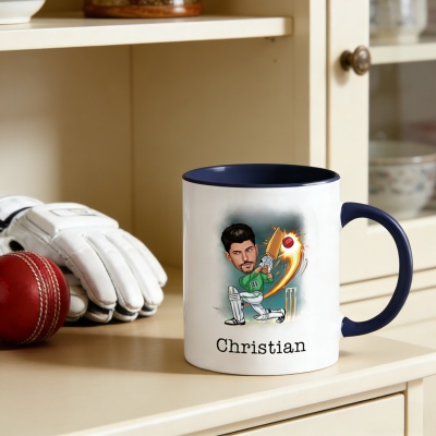 Diseño de caricatura de jugador de cricket : esta taza presenta una divertida caricatura de jugador de cricket con detalles personalizados, que captura la pasión, la energía y el espíritu del juego en un estilo audaz y divertido que se destaca en cualquier escritorio o mesa.