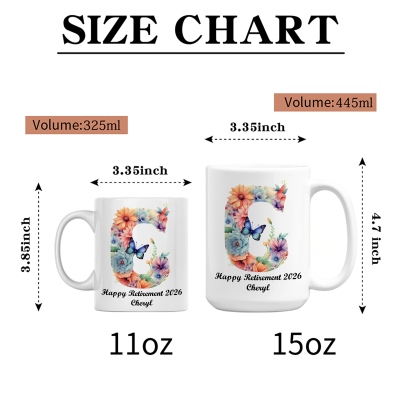 Elegante diseño floral con alfabeto : Esta taza "Feliz Jubilación" presenta un elegante alfabeto floral con un delicado detalle de mariposa, lo que le da un estilo cálido y estimulante. Su forma sencilla y sus detalles en dos tonos crean un ambiente alegre que alegra cualquier día.