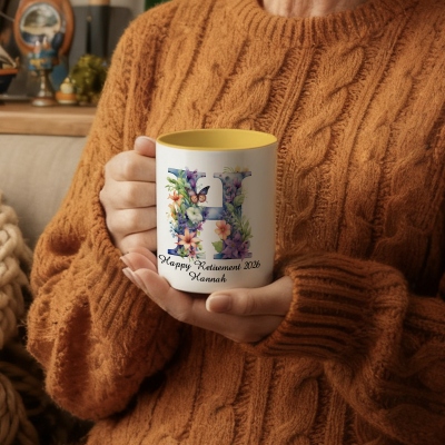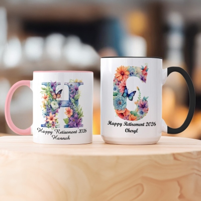 | Estilo | Taza personalizada con nombre, alfabeto floral y texto "Feliz jubilación" |