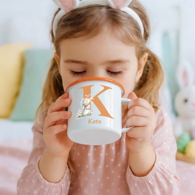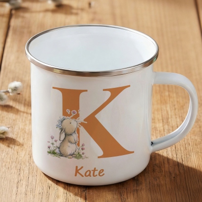 Diseño Floral de Conejito Alfabético : Esta taza esmaltada presenta un adorable conejito con suaves detalles florales y un alfabeto, creando un alegre ambiente pascual. Su forma clásica de 355 ml, con borde redondeado y asa resistente, le da un toque atemporal a tu taza de camping.