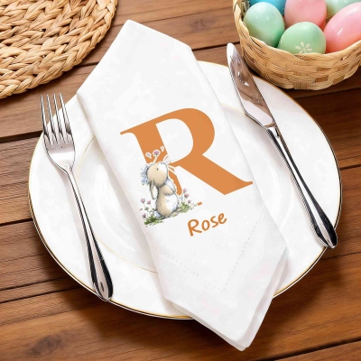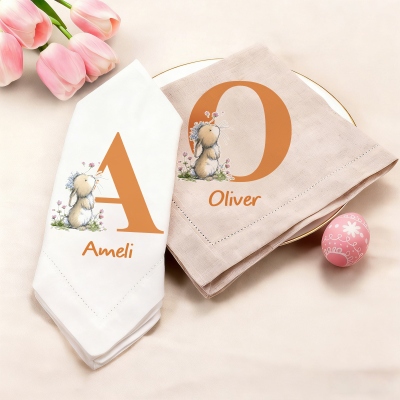 Diseño de Conejito Alfabético : Esta servilleta de lino presenta un conejito floral con una letra del alfabeto, creando un ambiente alegre y colorido para la mesa. Los suaves detalles florales y el adorable conejito le dan un toque primaveral, perfecto para celebraciones de Pascua y reuniones familiares.