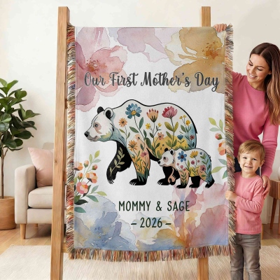 Diseño Familiar Cálido : Esta manta presenta una tierna ilustración de una mamá osa con su cachorro, adornada con delicados detalles florales que simbolizan el amor, el cuidado y el estrecho vínculo entre madre e hijo. Su elegante diseño aporta un toque acogedor y entrañable a cualquier dormitorio o sala de estar.