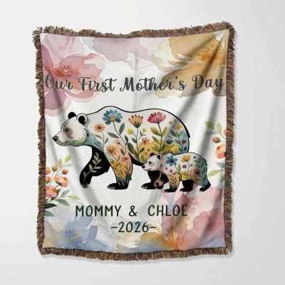 | Estilo | Manta personalizada con nombre, diseño floral, mamá osa y cachorro, con borlas. |
