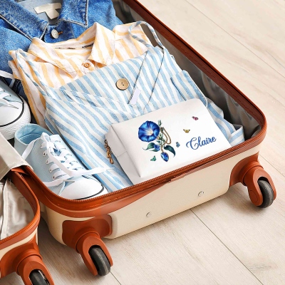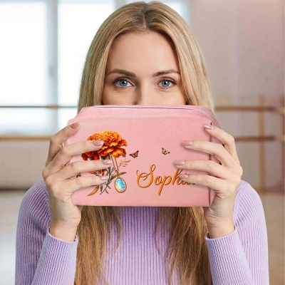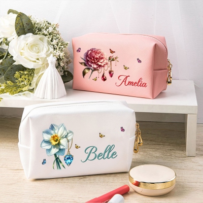 Bolsa de maquillaje personalizada con nombre, piedra preciosa y flor de nacimiento