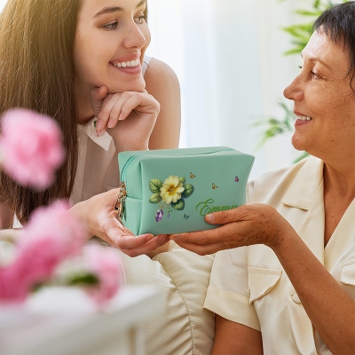 Diseño floral único : Este estuche para cosméticos luce un refinado ramo de flores de nacimiento con sutiles detalles en gemas. La personalización con un nombre y una flor de nacimiento a juego le da un toque especial, combinando delicados elementos florales con una personalización significativa para reflejar su mes de nacimiento y su estilo personal con elegancia.