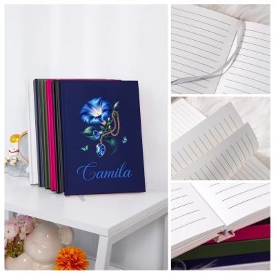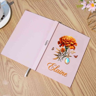 | Estilo | Cuaderno personalizado con nombre, piedras preciosas y flores de nacimiento |