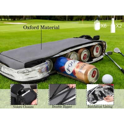 Aislante y funcional : Diseñado para mantener las bebidas frías, su interior aislante tiene capacidad para hasta seis latas o botellas estándar. Cuenta con un compartimento principal con cremallera y forro plateado para una óptima retención de la temperatura, además de un bolsillo exterior para guardar tarjetas de puntuación, gafas de sol o pequeños objetos esenciales.