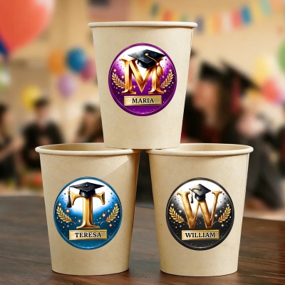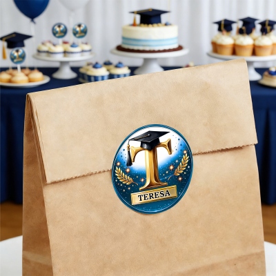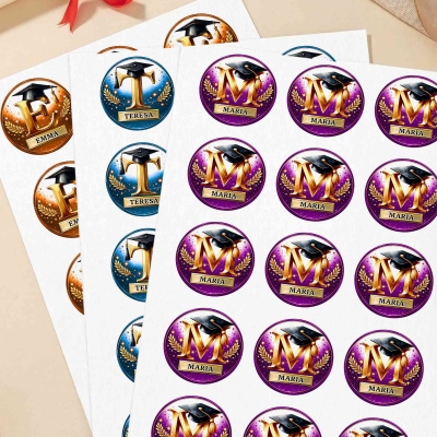 Nombre personalizado : personaliza cada pegatina con un nombre y la letra correspondiente para crear un detalle único para los graduados. Este toque personal ayuda a que los invitados se sientan especiales y añade un toque memorable a los regalos y la decoración de la fiesta.