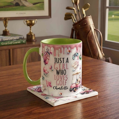 | Estilo | Taza personalizada con el nombre "Solo una chica a la que le encanta el golf". |