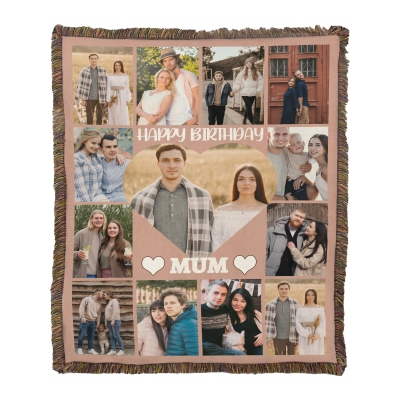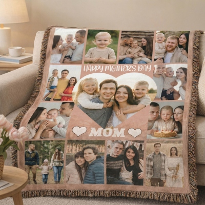 Diseño de cuadrícula fotográfica en forma de corazón : esta manta presenta un corazón en el centro y una cuadrícula fotográfica con tus recuerdos favoritos, junto con un texto personalizado para un toque cálido y emotivo. El diseño resalta el amor, la conexión y los momentos familiares con un estilo sencillo pero llamativo.