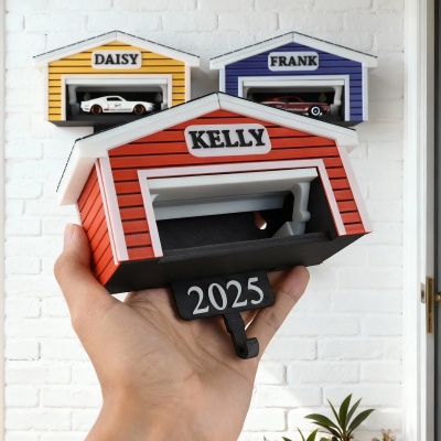 Diseño inspirado en un garaje : Este llavero de pared, con forma de garaje en miniatura, cuenta con una puerta funcional que se abre para revelar un pequeño espacio ideal para exhibir maquetas de coches. Incluye un gancho para llaves, combinando creatividad y practicidad para convertir tu pared en una vitrina original.
