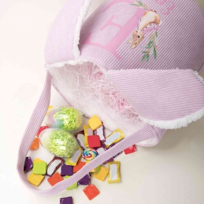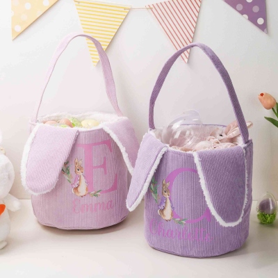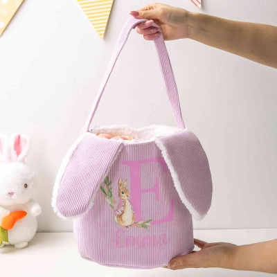 Diseño del Alfabeto de Peter Rabbit : Esta canasta de Pascua presenta un encantador tema de Peter Rabbit, combinado con una gran letra del alfabeto y divertidas orejas de conejo. Su suave forma de cubo de pana ofrece un aspecto adorable y clásico que encanta a los niños, mientras que su amplia estructura es perfecta para una emocionante búsqueda de huevos de Pascua.