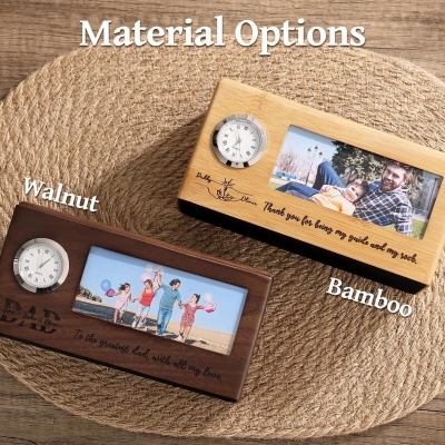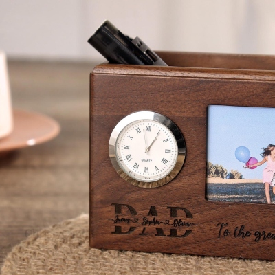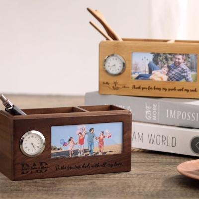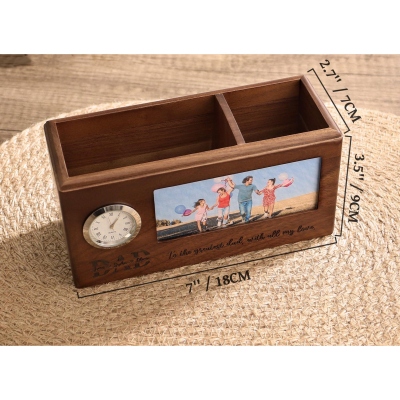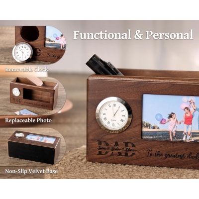 Funcional y personal : Este elegante organizador de escritorio de madera combina un portalápices, un reloj analógico y un marco de fotos en una sola pieza. Está diseñado para aportar practicidad y valor sentimental a cualquier espacio de trabajo. Ya sea en la oficina o en casa, mantiene tus objetos esenciales organizados.