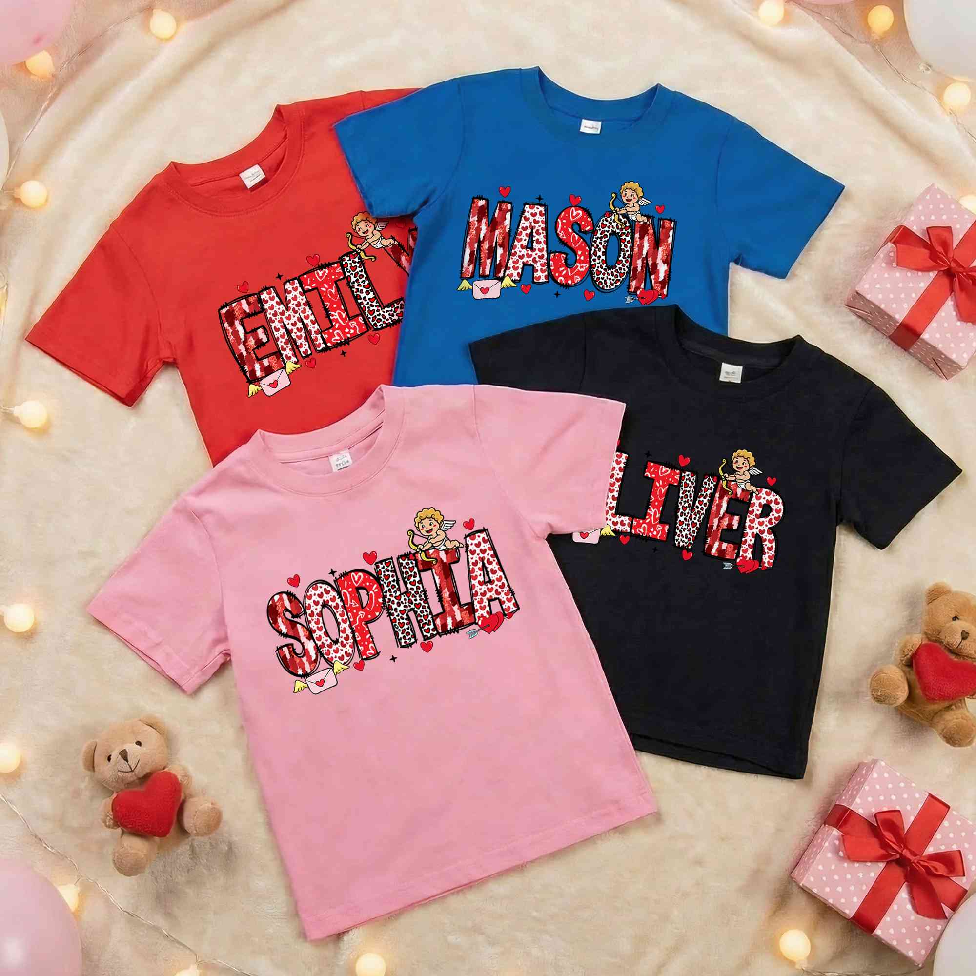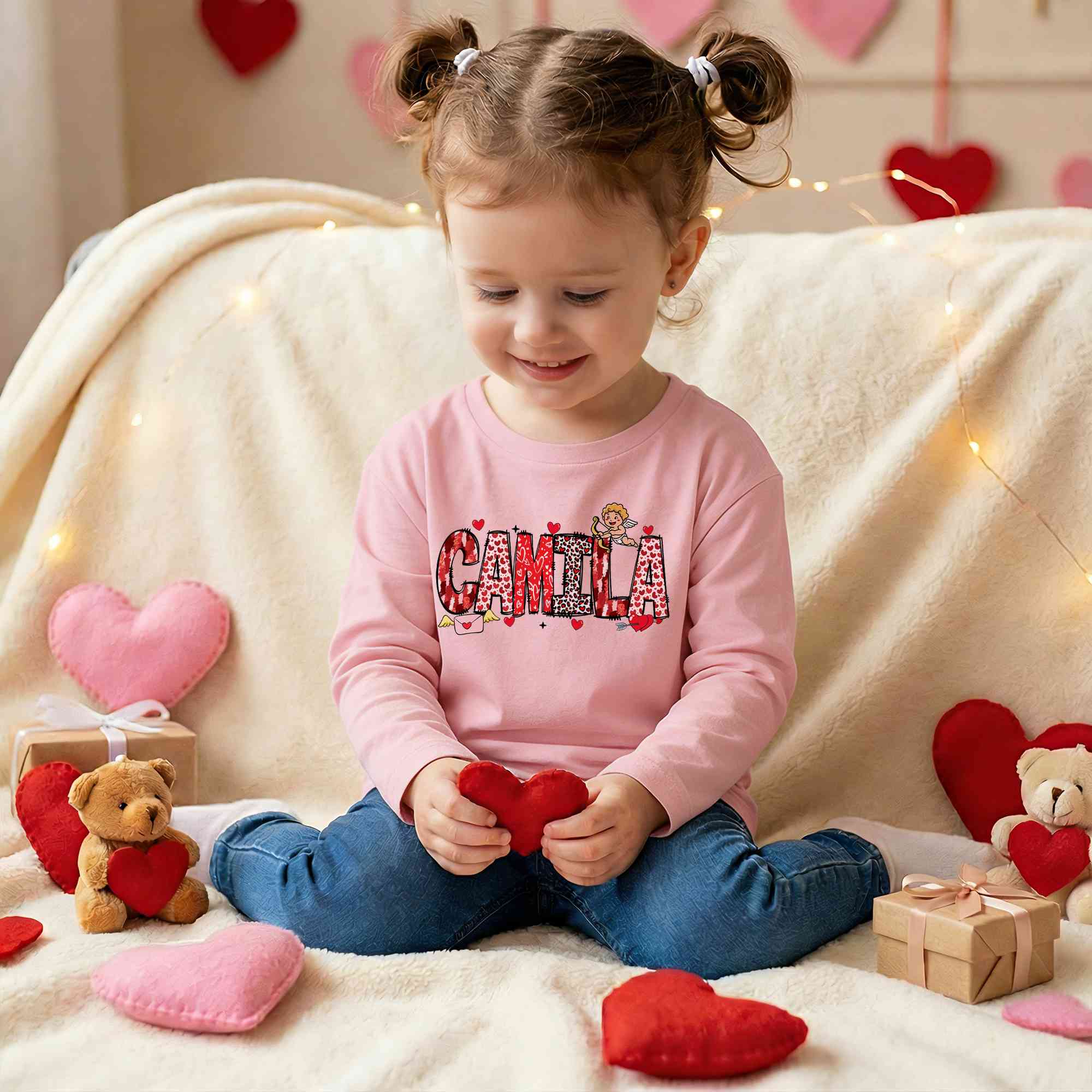 Diseño Alfabético de Corazones : La camiseta o sudadera presenta encantadoras letras rojas con forma de corazón, creando un look adorable y significativo que celebra el amor con un estilo sencillo y divertido. El diseño es cálido y alegre, perfecto para atuendos de San Valentín tanto para niños como para adultos.