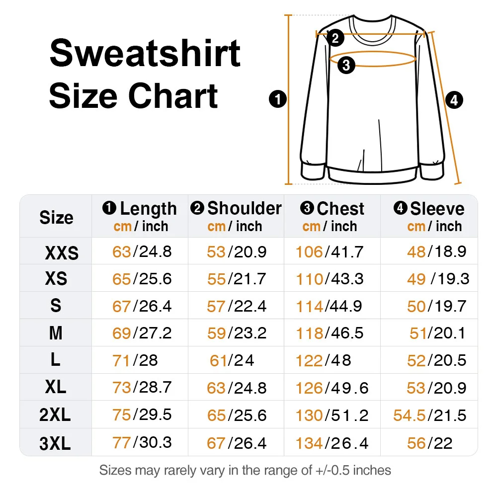 | Medidas | Camiseta de adulto: XXS, XS, S, M, L, XL, 2XL, 3XL, 4XL, 5XL; Sudadera de adulto: XXS, XS, S, M, L, XL, 2XL, 3XL; Camiseta/sudadera de niño: 3-4 años, 5-6 años, 7-8 años, 9-10 años, 11-12 años, 13 años |
