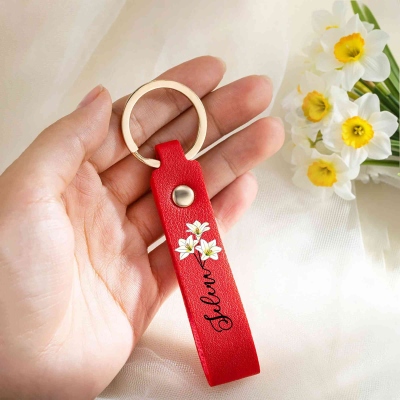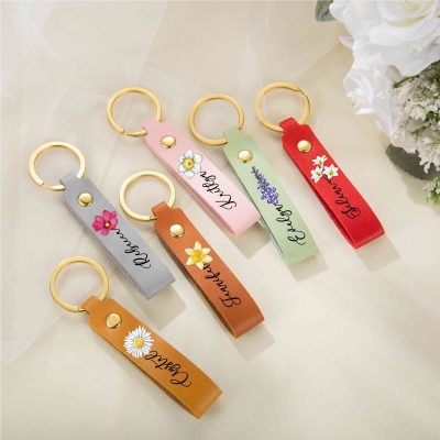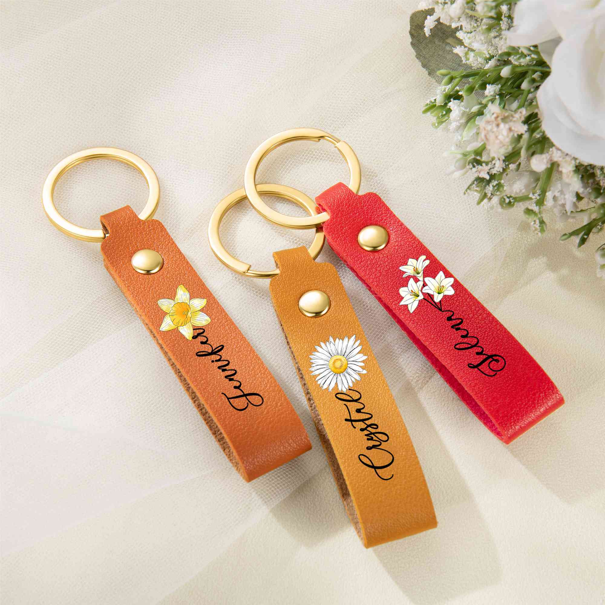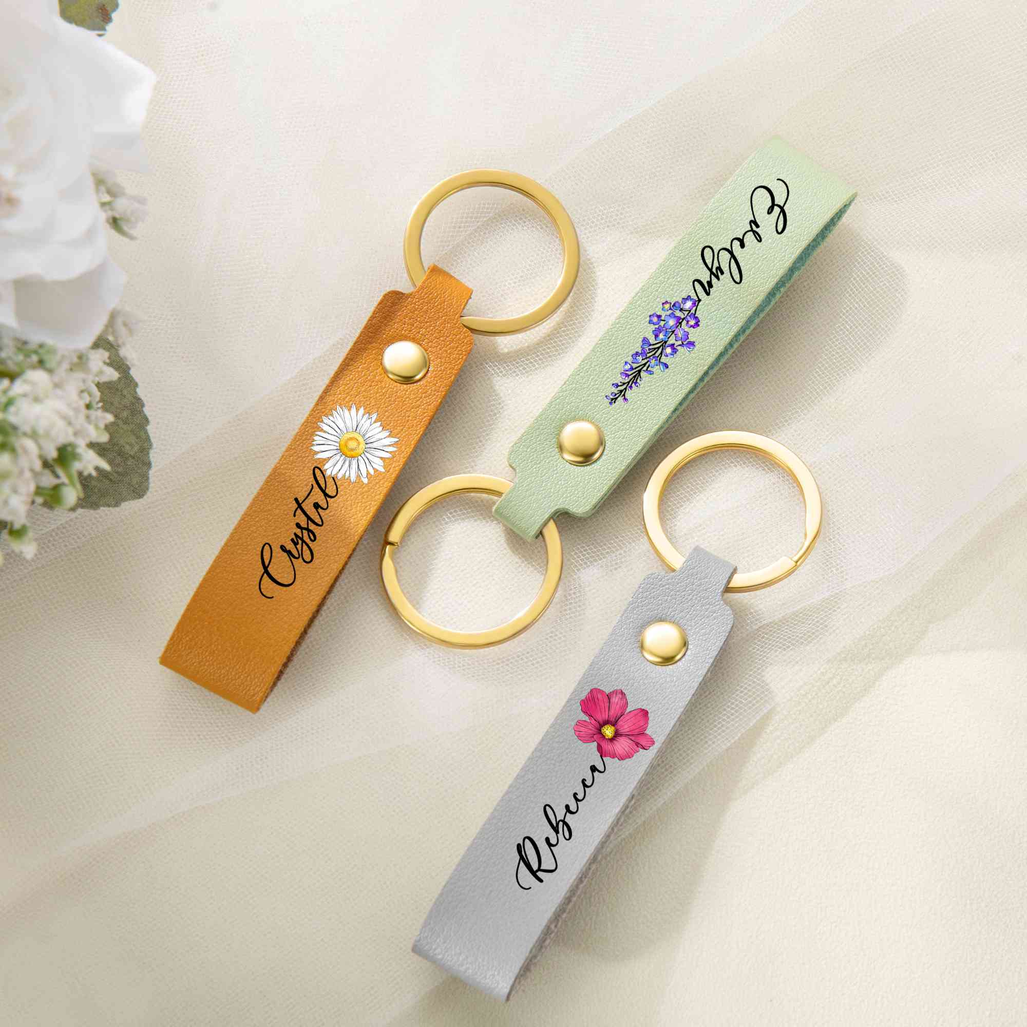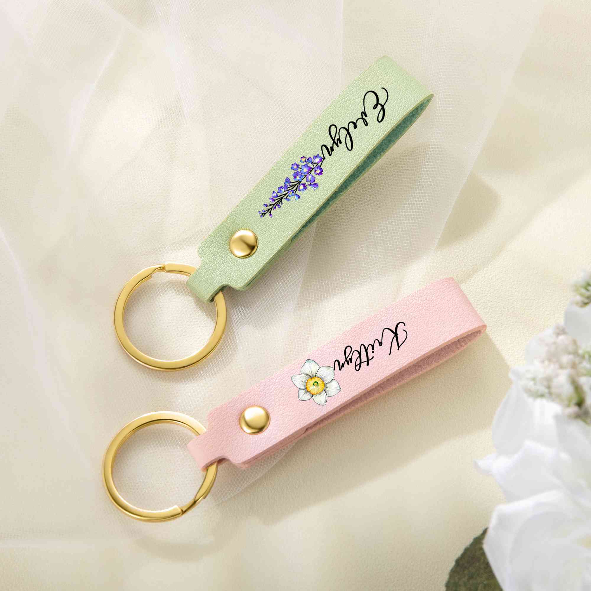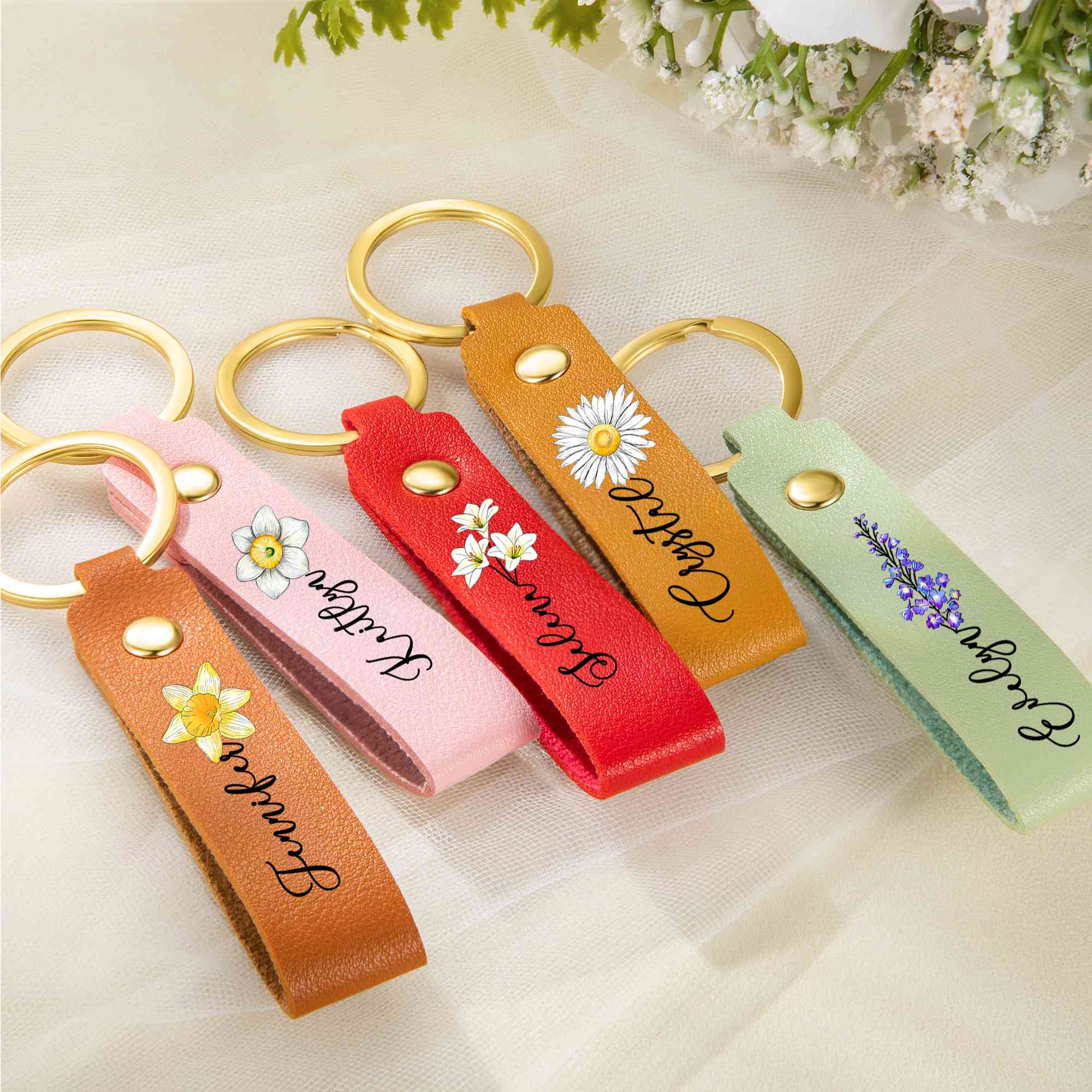 Llavero personalizado de flor de nacimiento de acuarela con nombre, llavero de cuero sintético, recuerdo de despedida de soltera, regalo de cumpleaños o boda para ella, mamá, mejores amigas o mujeres.