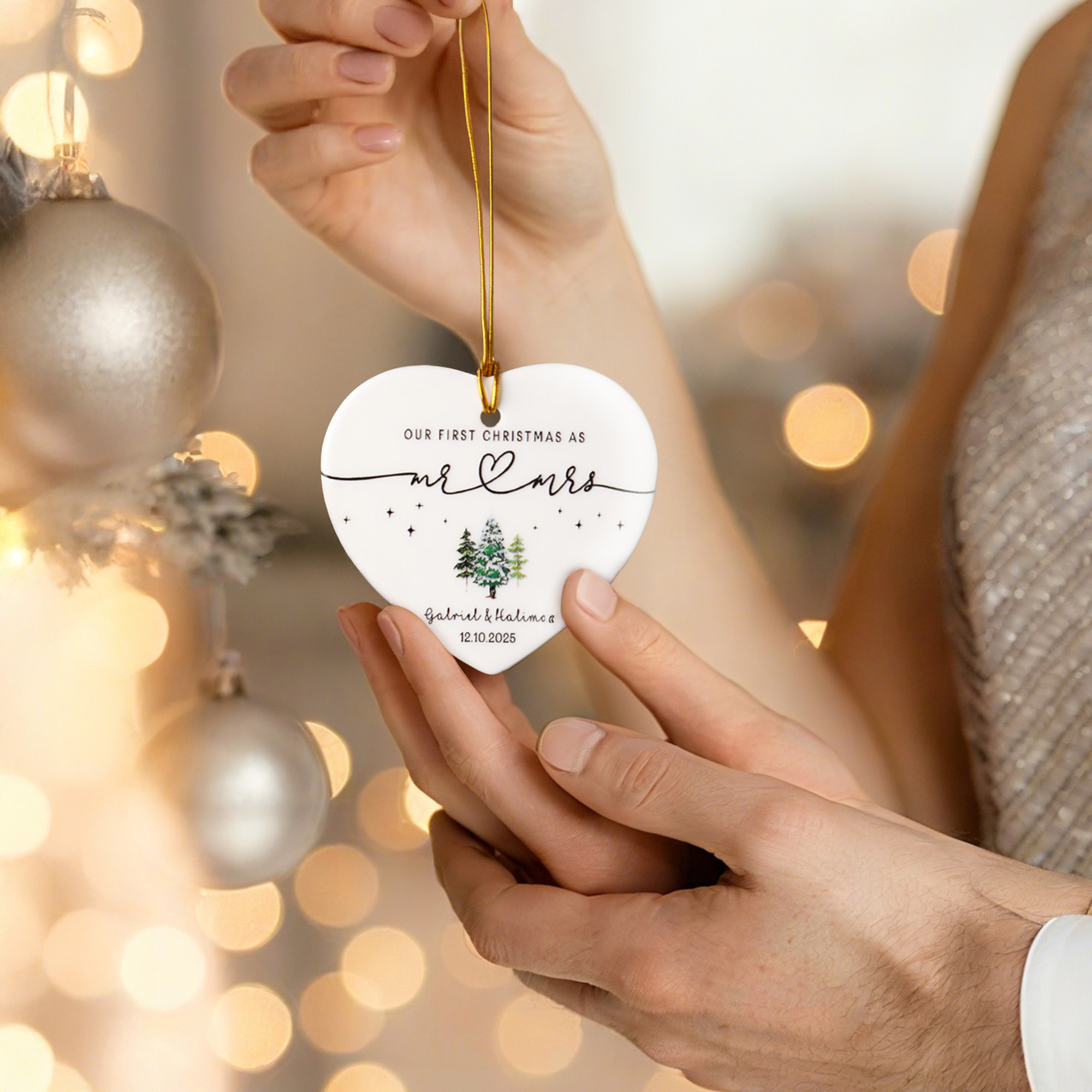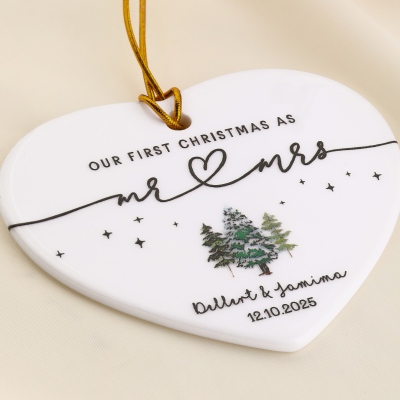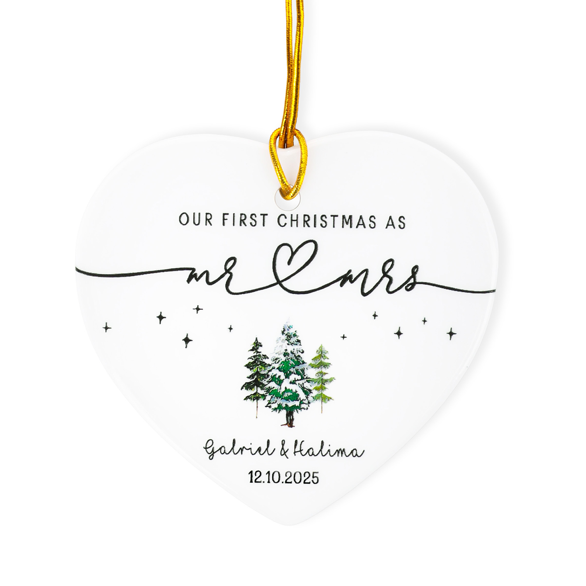 Adorno de Corazón Encantador - Este precioso adorno presenta la clásica forma de corazón que simboliza bellamente el amor y la unión. Su delicada forma y elegante tipografía aportan un toque romántico a cualquier árbol de Navidad, perfecto para celebrar las primeras fiestas navideñas como pareja casada.