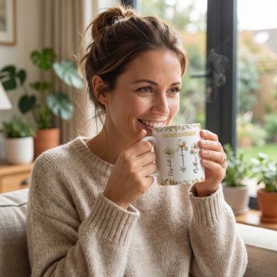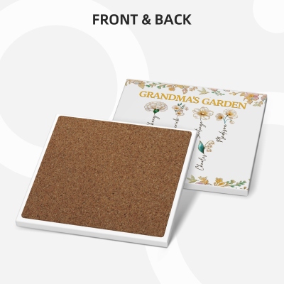 Diseño floral único : este juego de taza y posavasos presenta un diseño conmovedor inspirado en las flores de nacimiento y los nombres de la familia. Cada miembro de la familia puede estar representado con su flor y un nombre personalizado, creando un tema único llamado "El jardín de la abuela". Este detalle transforma un juego cotidiano en un recuerdo entrañable que refleja el amor y la unión familiar.