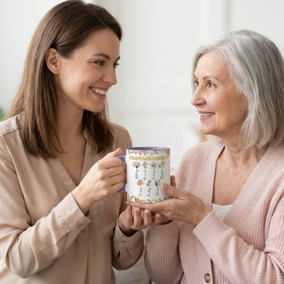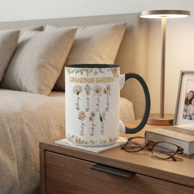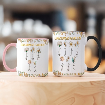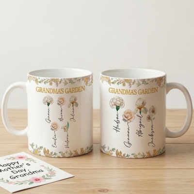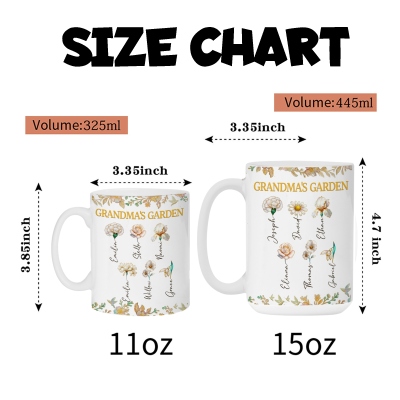 | Estilo | Taza con nombres personalizados, flores de nacimiento y el diseño del jardín de la abuela. |