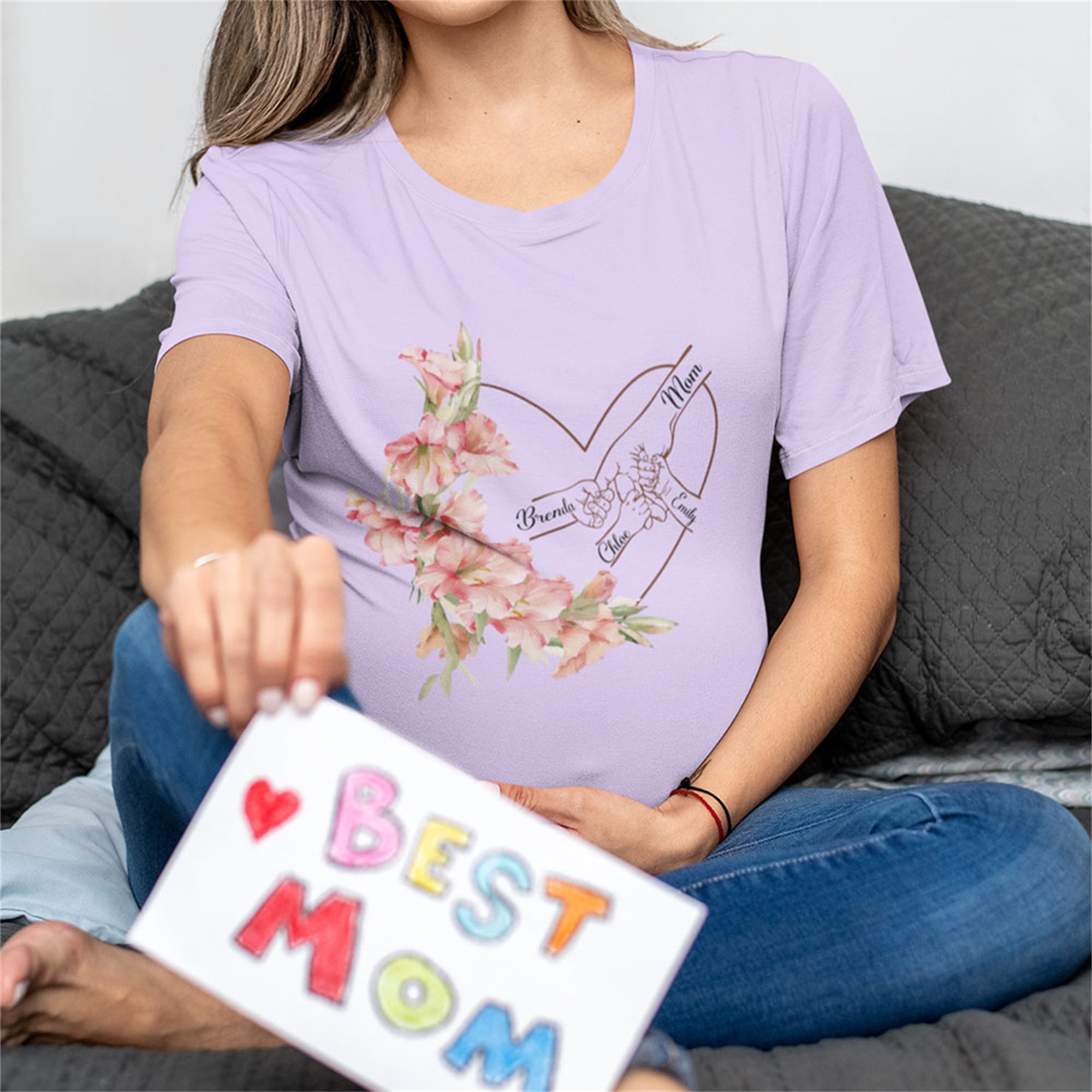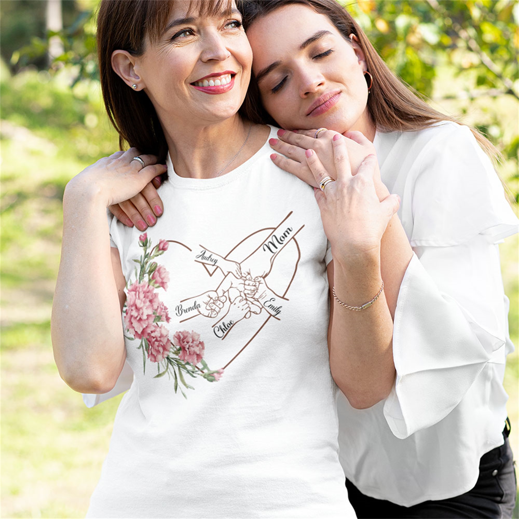 Toque personalizado : añade la flor de nacimiento de tu mamá o abuela, y los nombres de tus hijos o nietos para crear una camiseta única. Cada detalle está cuidadosamente impreso para resaltar el vínculo familiar. Es una forma especial de llevar a tus seres queridos cerca, ya sea para una mamá orgullosa, una madre primeriza o una abuela dedicada.