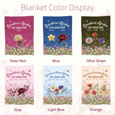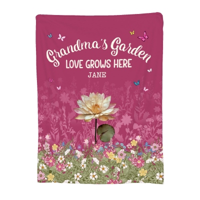 | Estilo | Manta personalizada con nombres y flores de nacimiento, mariposas y jardín de la abuela |