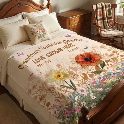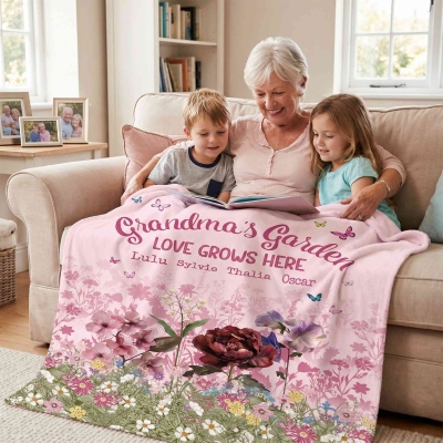 Diseño del Jardín de la Abuela : Esta manta presenta una hermosa temática de jardín, llena de mariposas y flores de nacimiento. Cada flor representa a un ser querido, creando una decoración colorida y significativa que celebra la familia. La suave obra de arte multicolor aporta calidez y un toque alegre a cualquier cama, sofá o sillón.