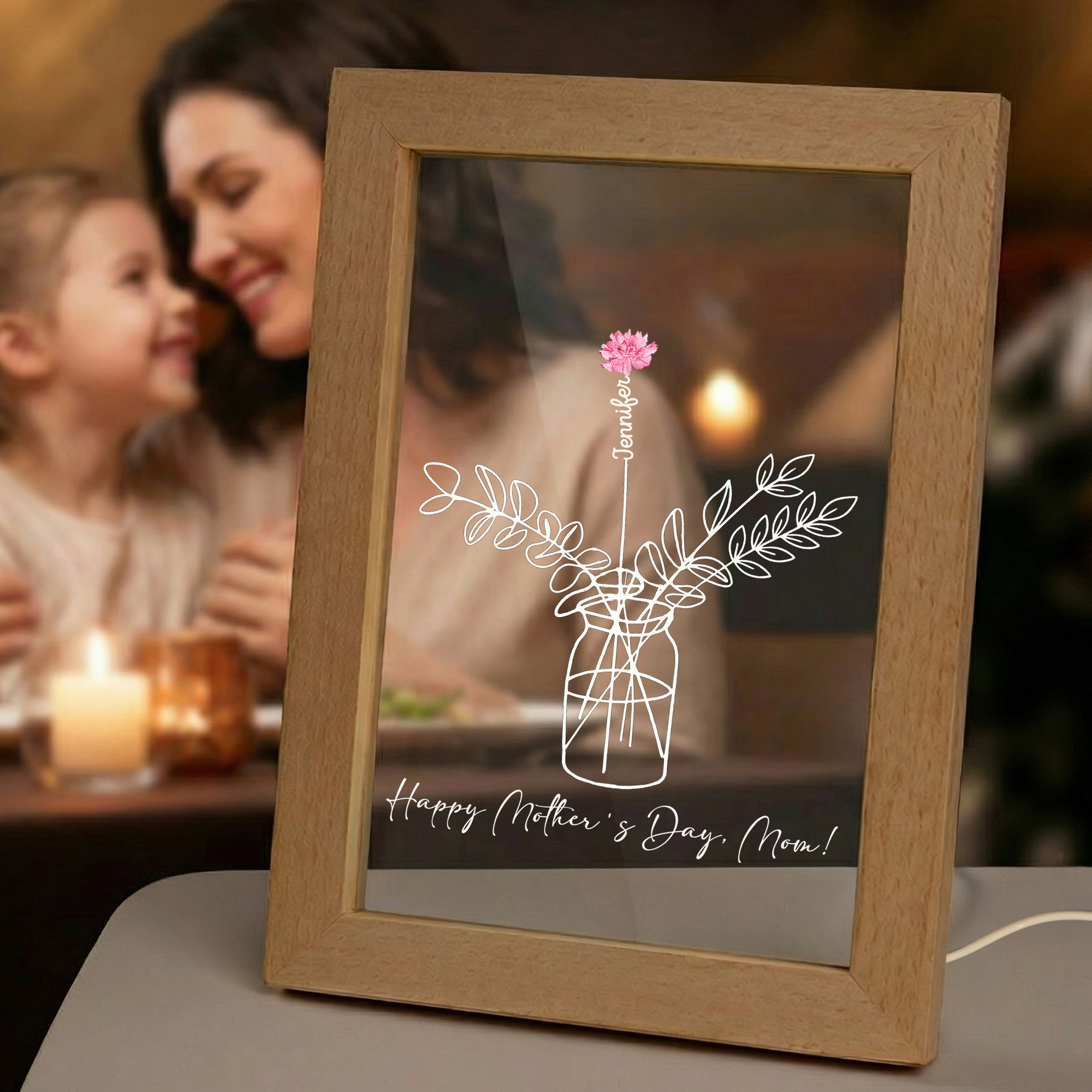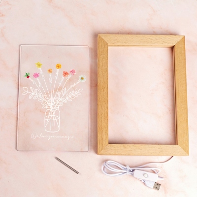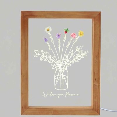 Elegante diseño de jarrón floral : esta lámpara de noche personalizada presenta una delicada forma de jarrón con flores de nacimiento y nombres pintados en acuarela, creando una imagen cálida y conmovedora. La combinación de marco de madera y panel acrílico le da un toque decorativo sencillo pero único, ideal para la decoración moderna del hogar.