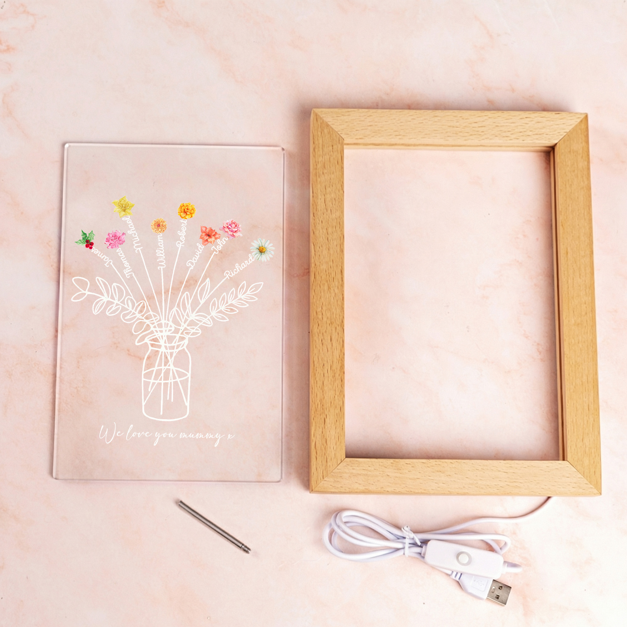 | Estilo | Lámpara de noche LED personalizada con letra floral escrita a mano y marco de madera. |