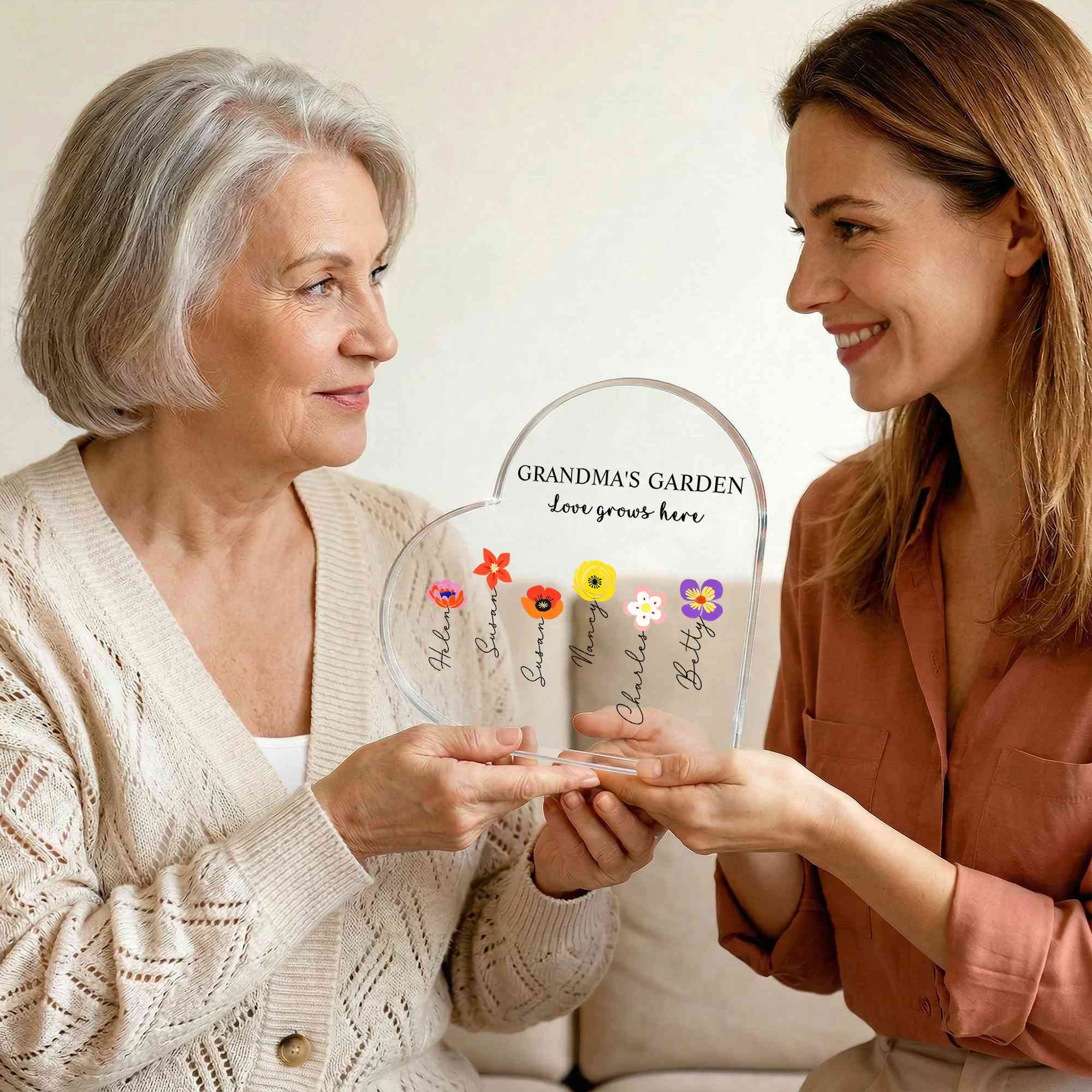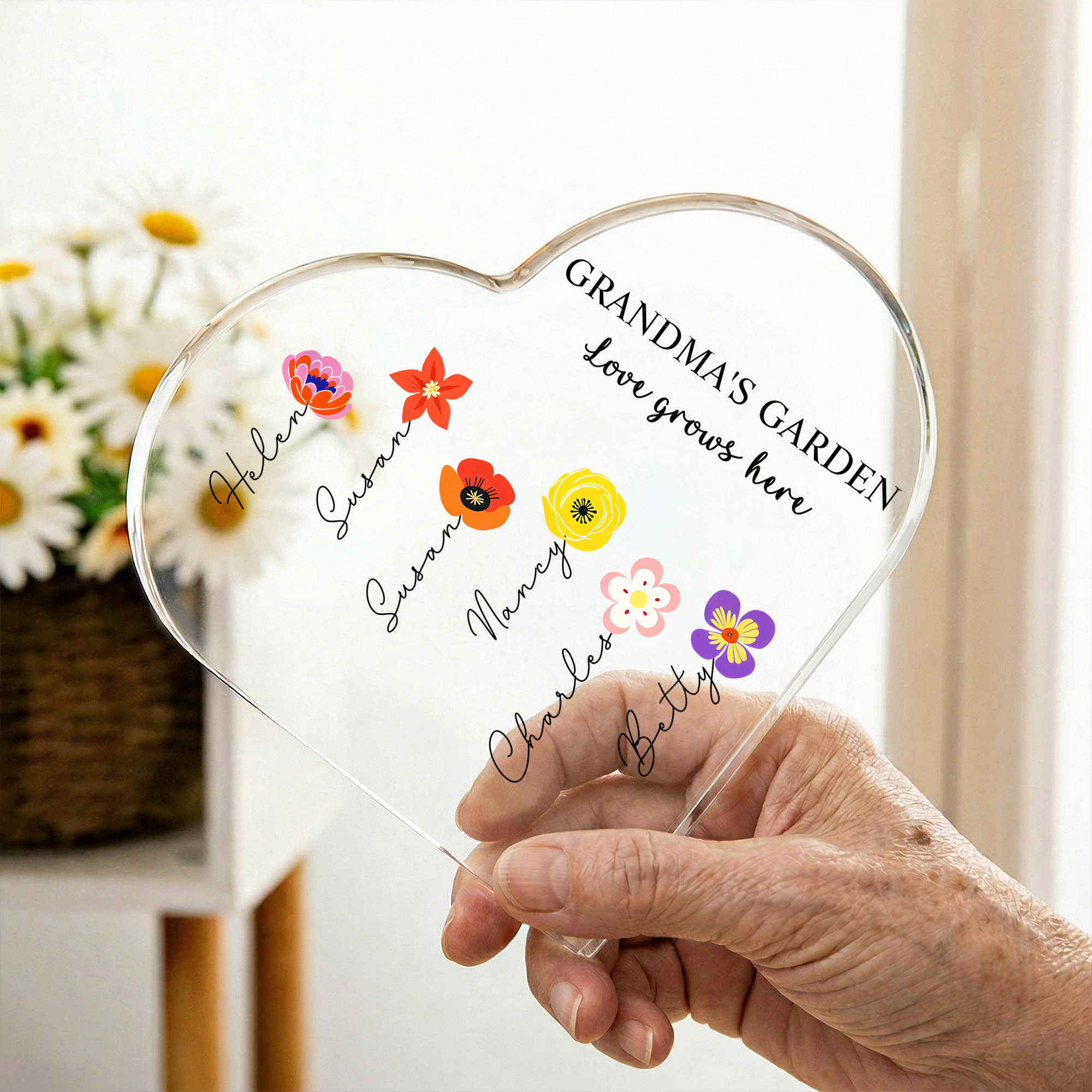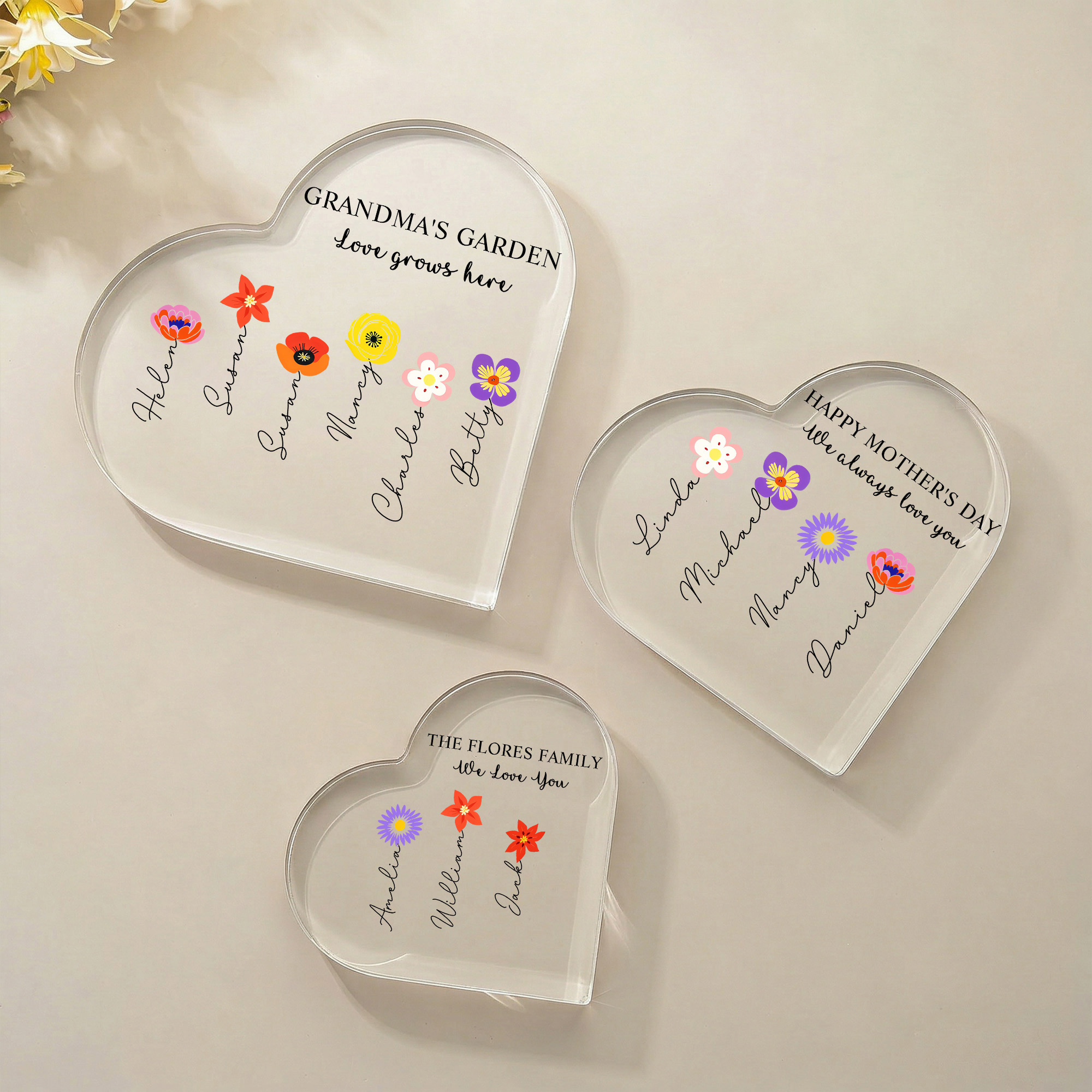 | Estilo | Nombres personalizados, flores de nacimiento coloridas, jardín de la abuela, placa en forma de corazón |