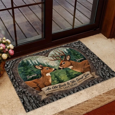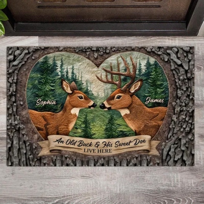 Felpudo de ciervo personalizado : un encantador felpudo de entrada que presenta un diseño en forma de corazón con dos ciervos uno frente al otro, que simbolizan el amor y el compañerismo en un entorno forestal.