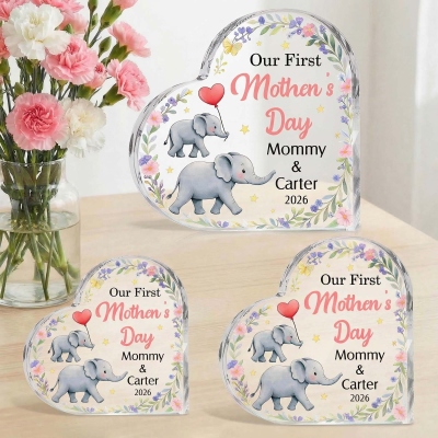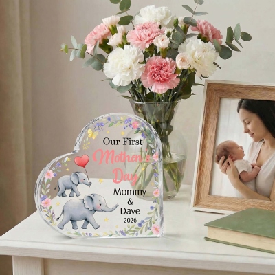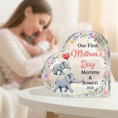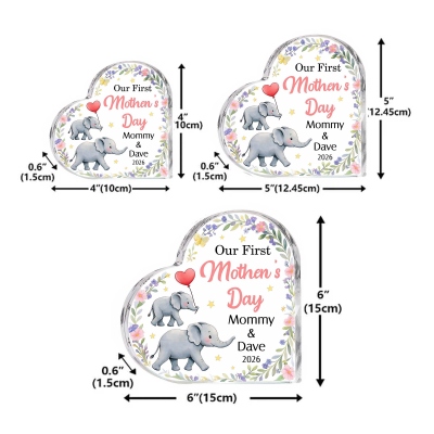 | Estilo | Placa acrílica en forma de corazón con diseño floral de elefante para mamá y bebé, con nombres personalizados, ideal para el primer Día de la Madre. |