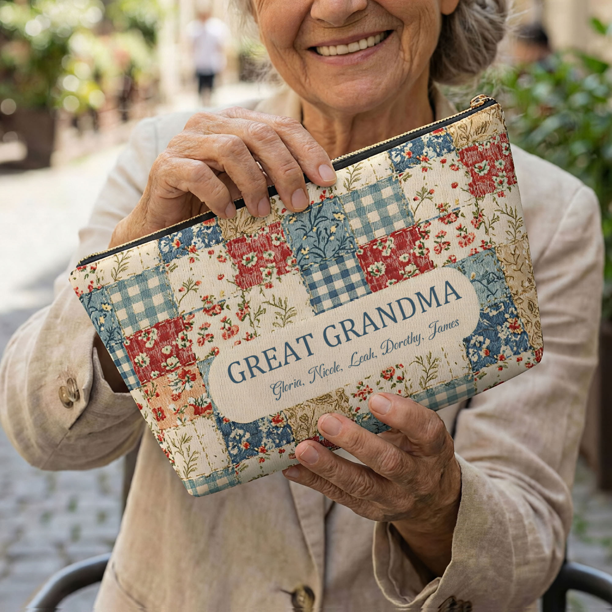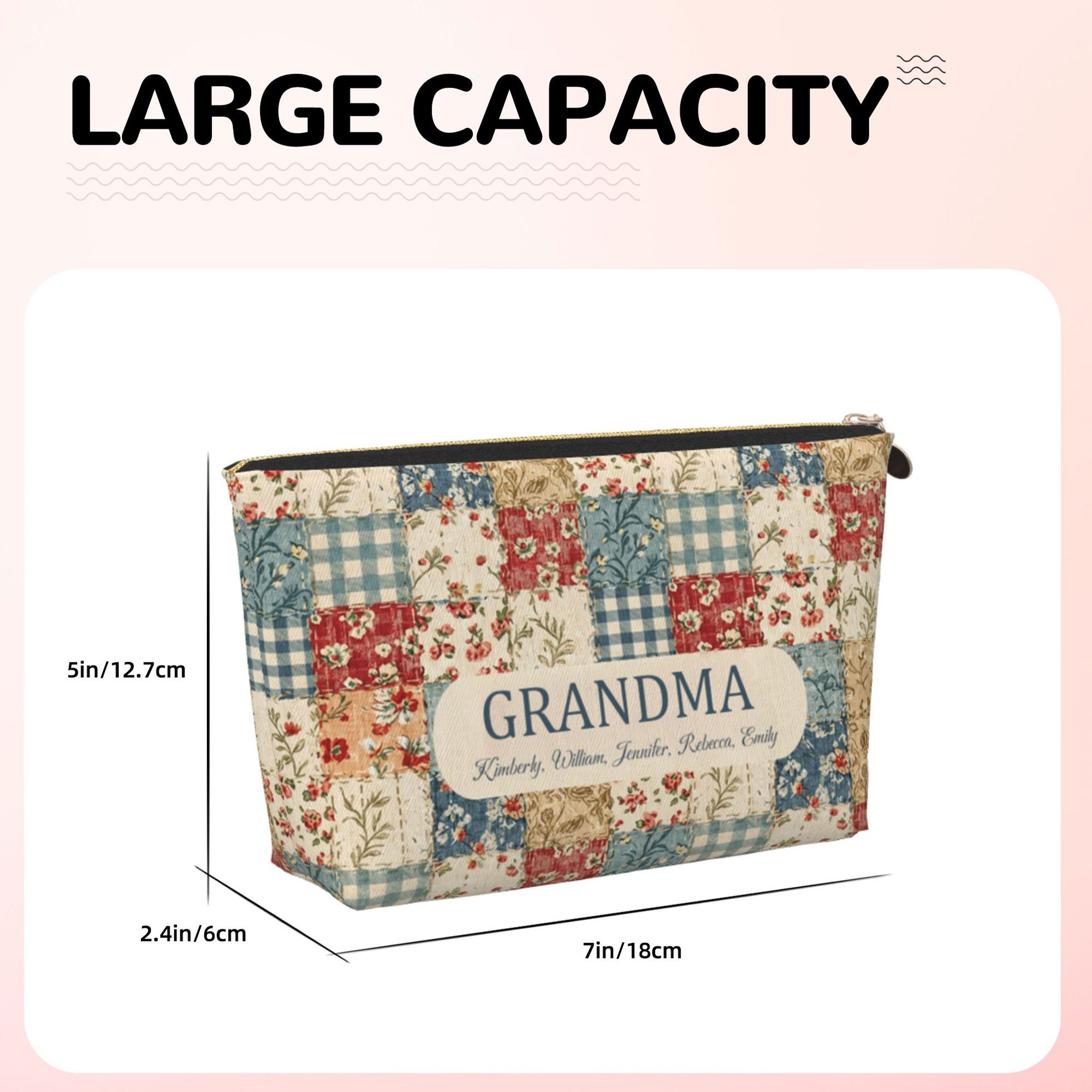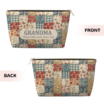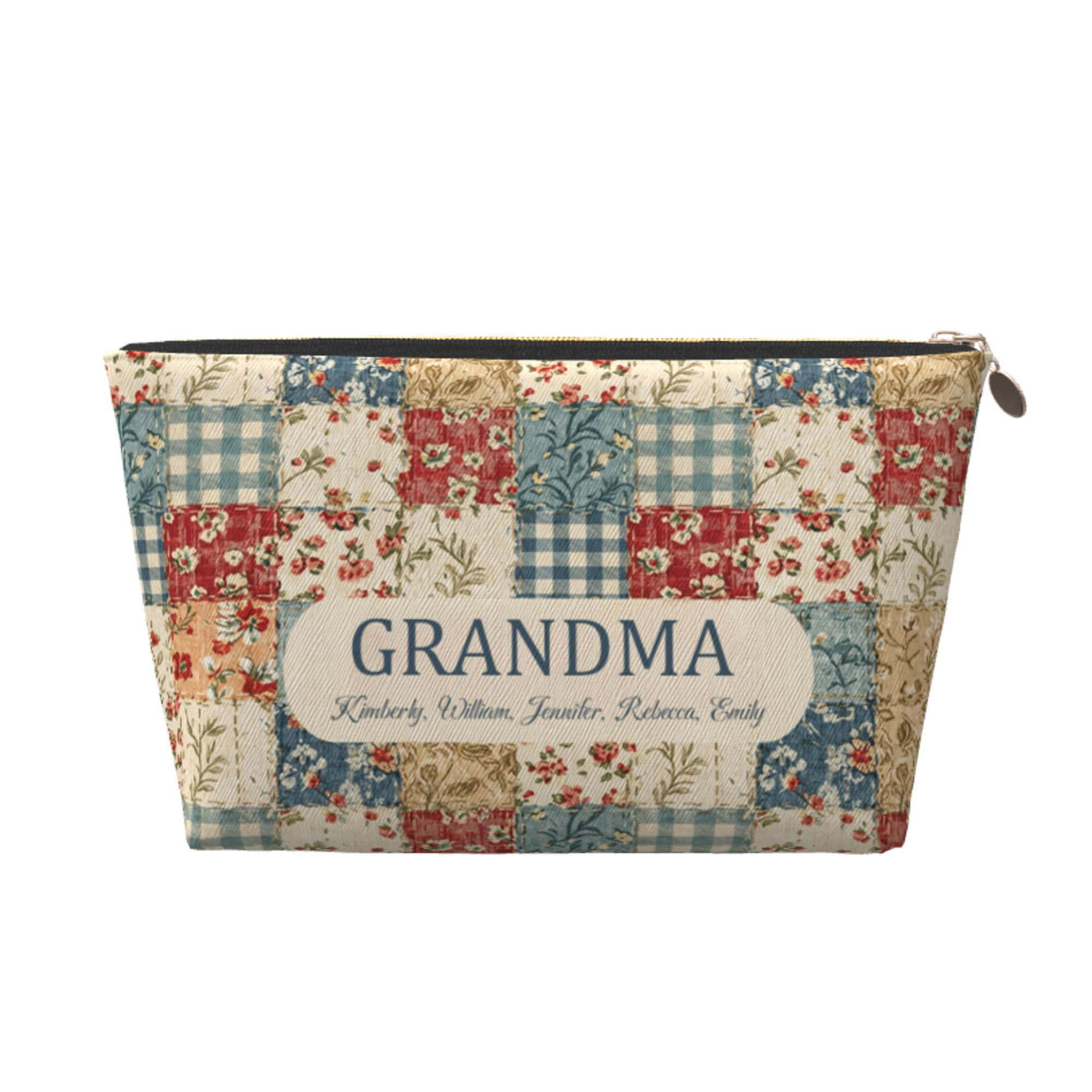 | Estilo | Neceser de viaje con diseño floral acolchado y patchwork, personalizado con nombres de la abuela. |