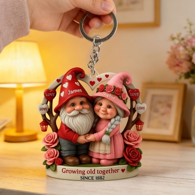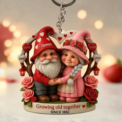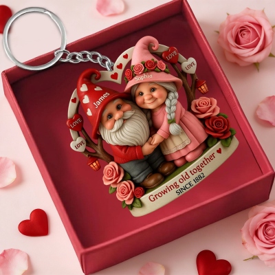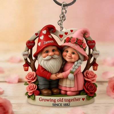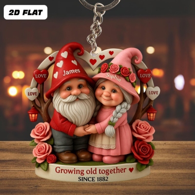 | Estilo | Llavero plano 2D con nombres personalizados y gnomos que envejecen juntos |