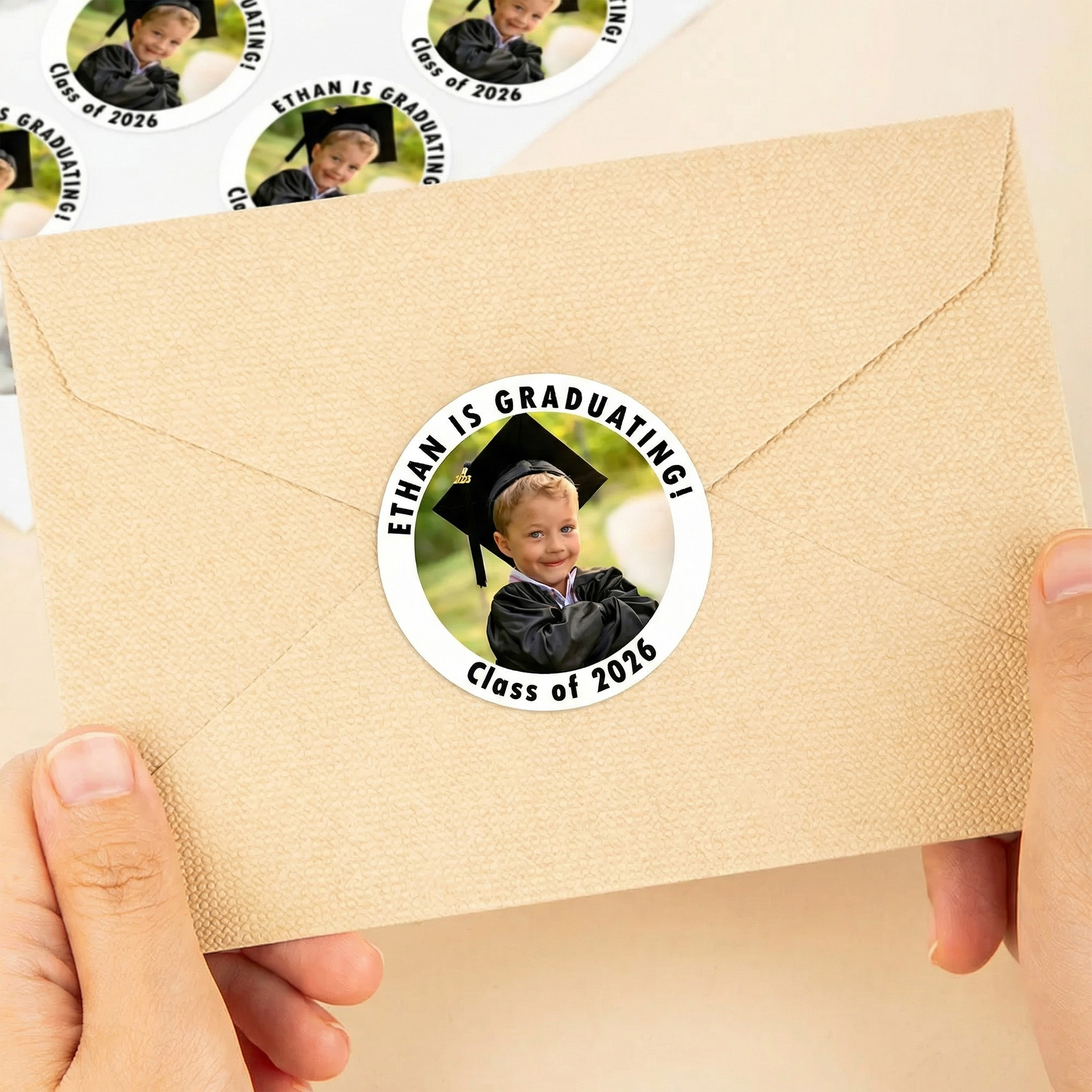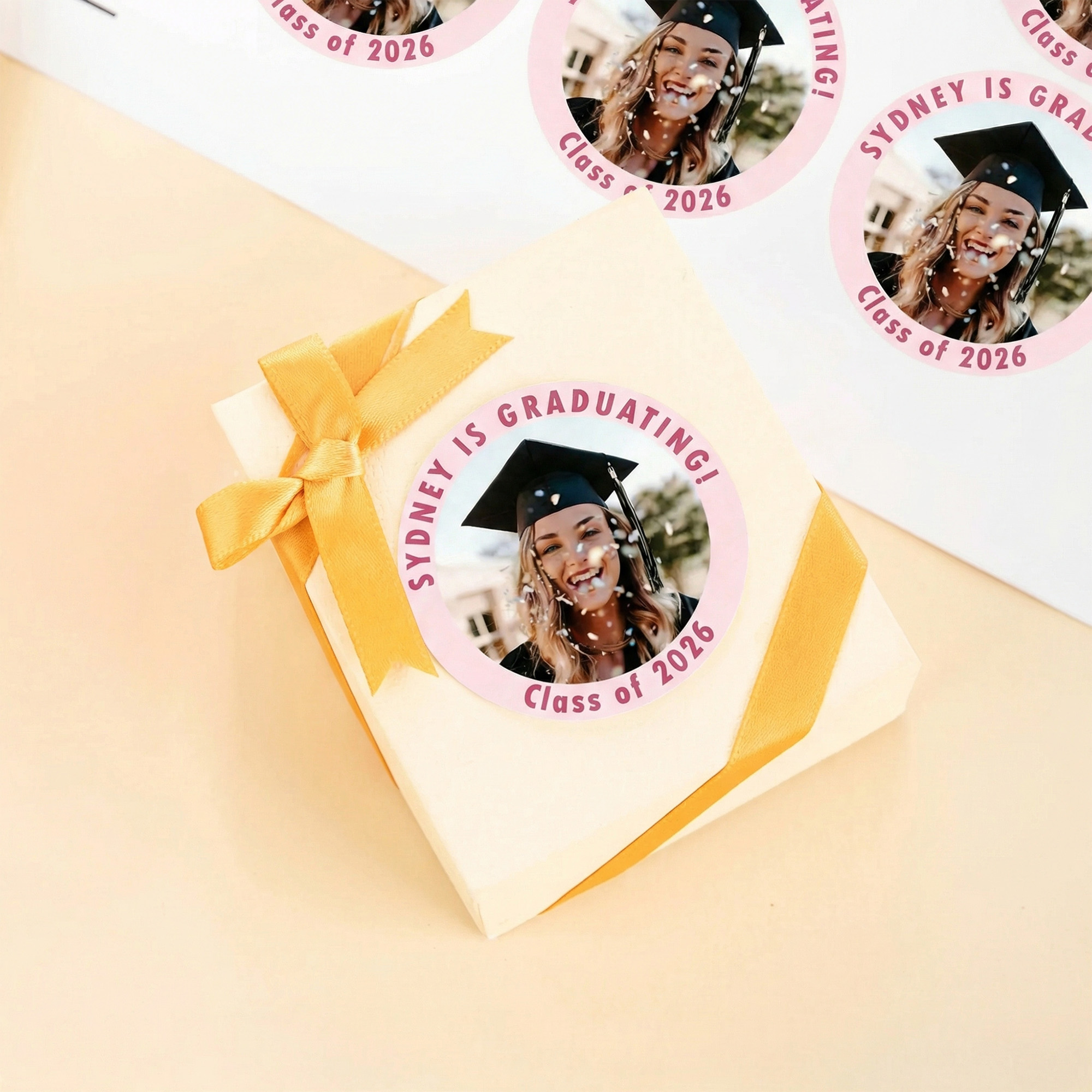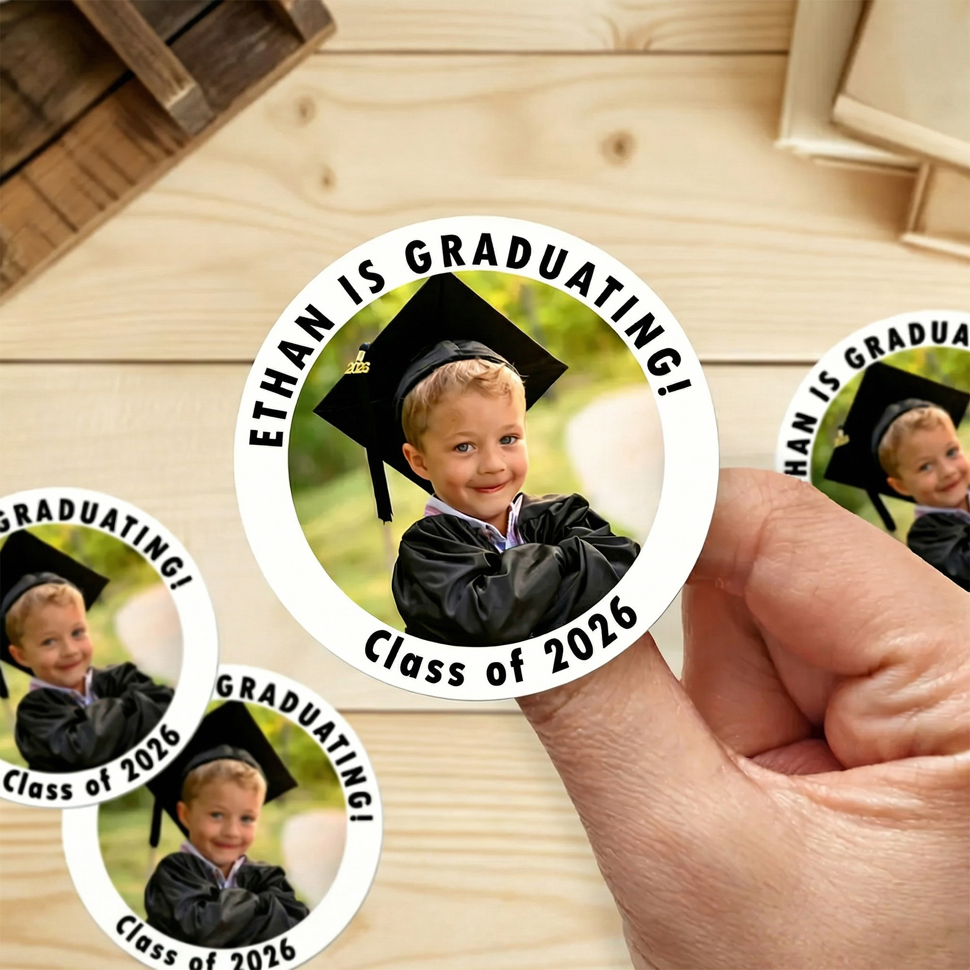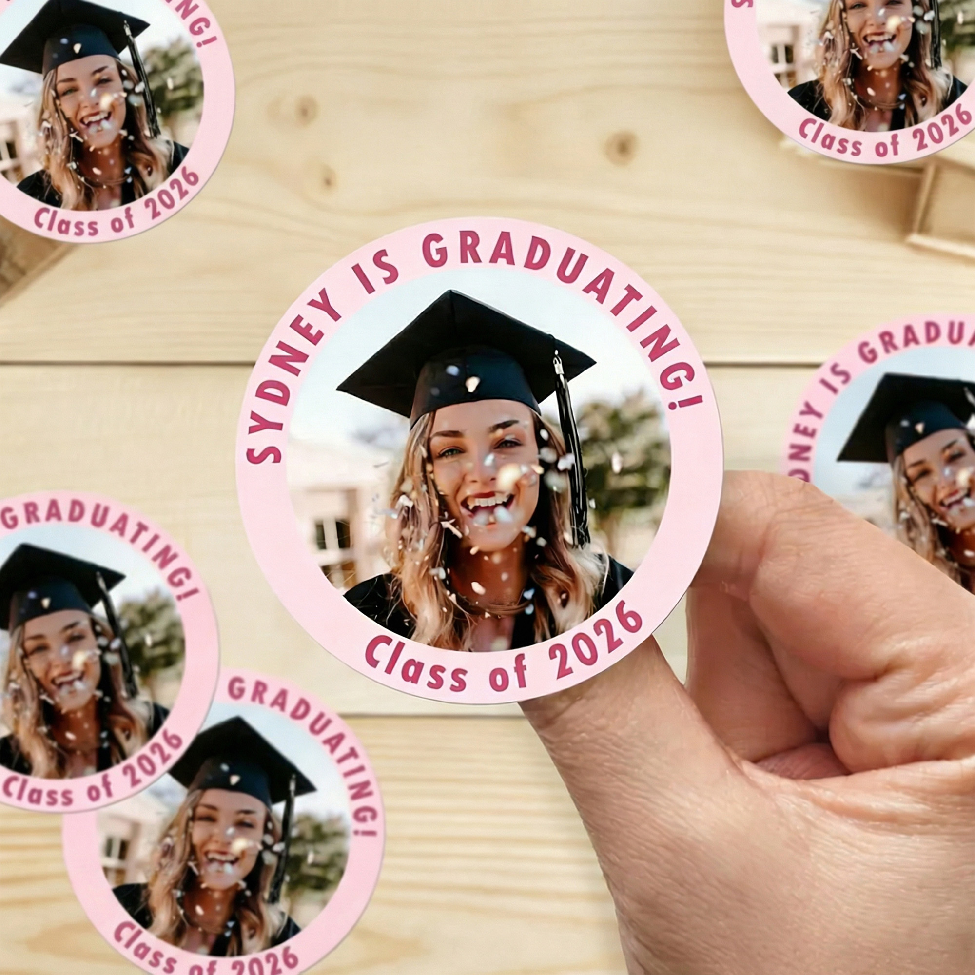 | Estilo | Pegatinas personalizadas de graduación con foto y nombre |