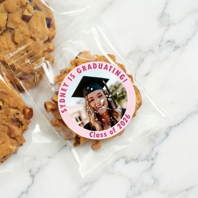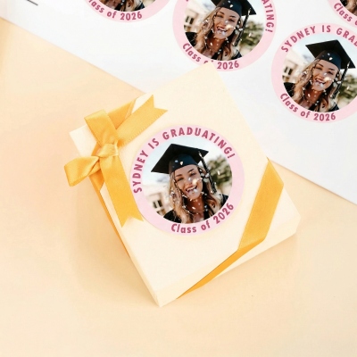 Pegatina de graduación : una alegre pegatina redonda que muestra la foto de tu graduado enmarcada por un texto llamativo con su nombre en una tipografía divertida, y la frase "Clase de 2026" elegantemente curvada debajo, capturando el orgullo en cada detalle.