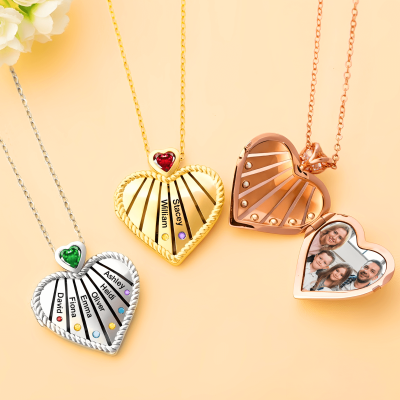Un toque personalizado : Dentro del medallón, se puede añadir una foto significativa para mantener a sus seres queridos cerca todos los días. El frente puede incluir nombres grabados junto con piedras de nacimiento que representan a familiares, hijos o a alguien especial, convirtiendo el collar en un recuerdo verdaderamente personal.