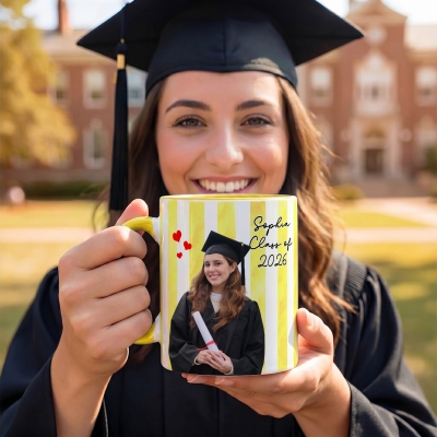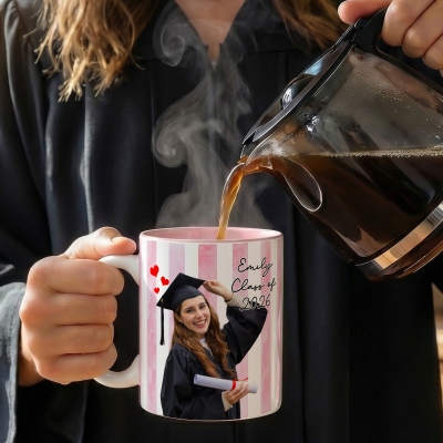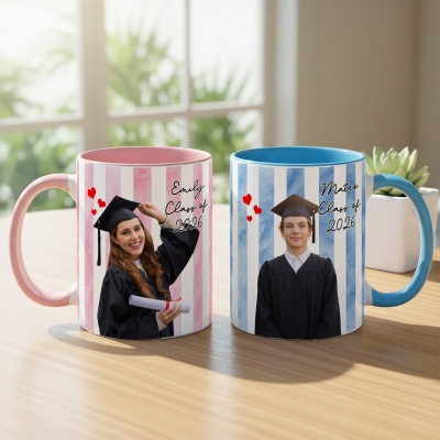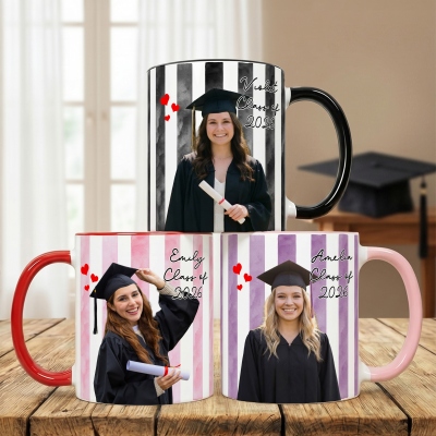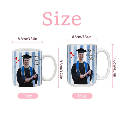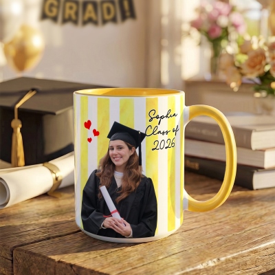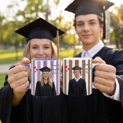 Taza de cerámica a rayas con un diseño vibrante para celebrar la graduación , que incluye tu foto, nombre y año de graduación. Un recuerdo entrañable para conmemorar este importante hito. Disponible en tamaños de 325 ml (11 oz) y 444 ml (15 oz), su elegante interior bicolor le da un toque alegre que destaca en cualquier cocina u oficina.
