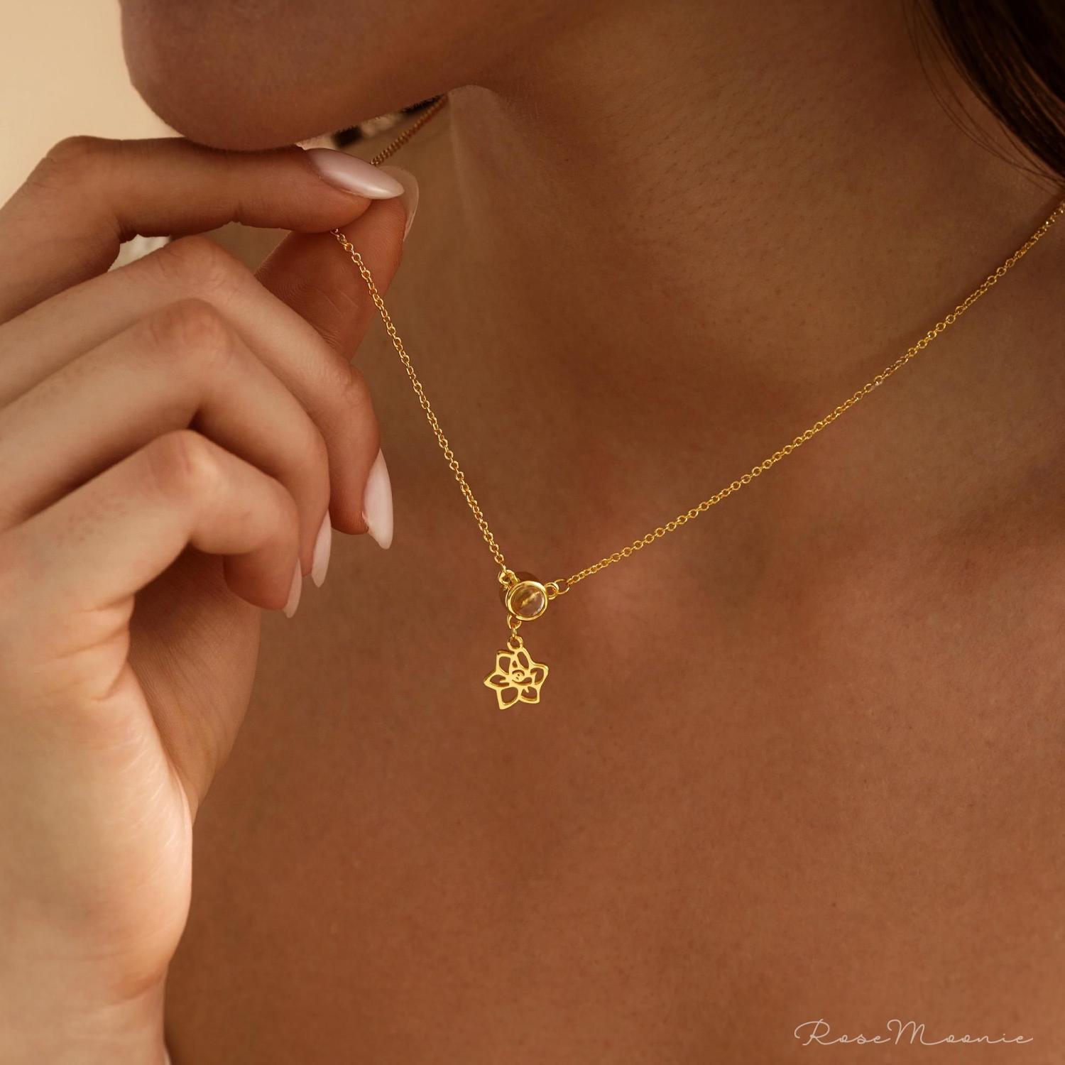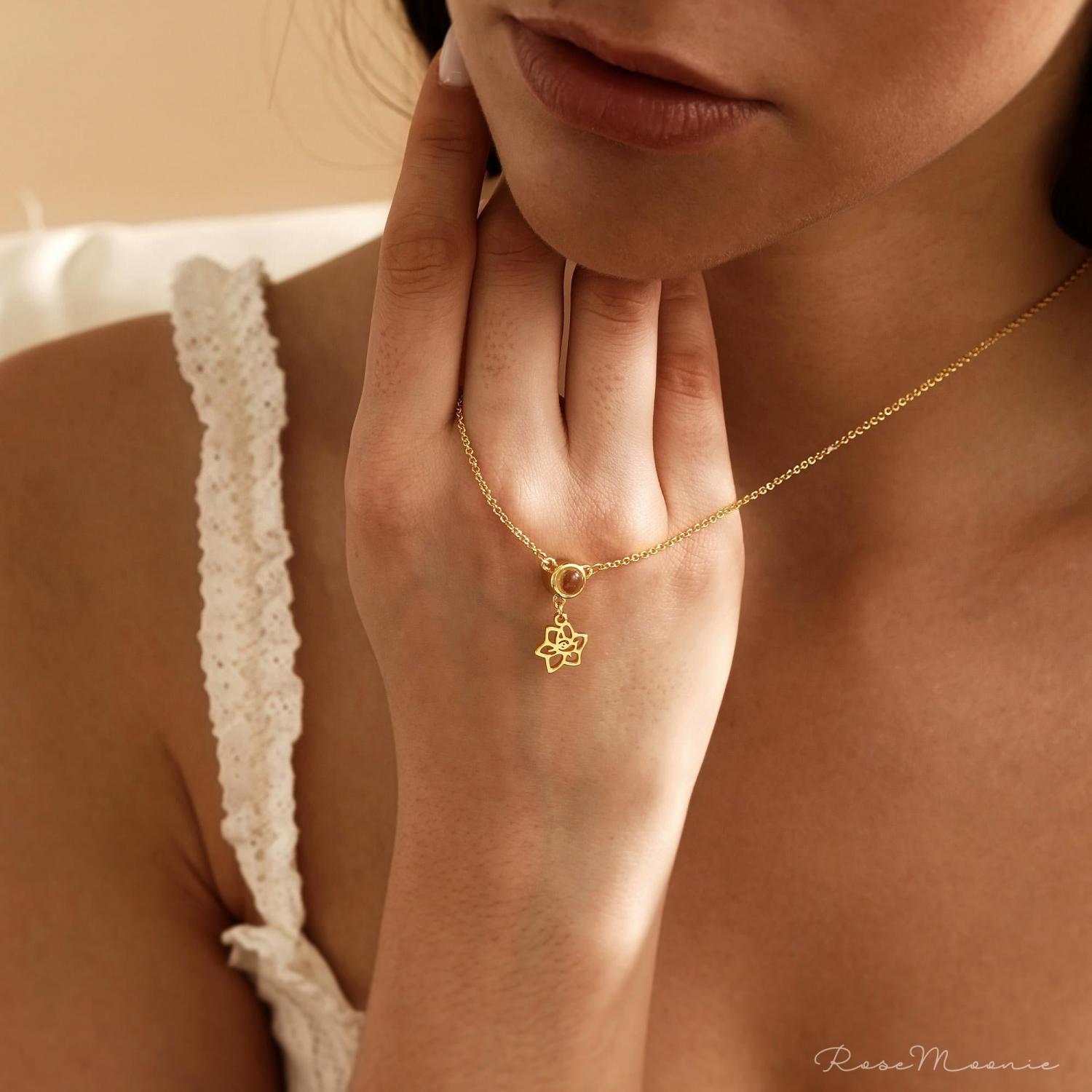 Dije de flor de nacimiento personalizado : Debajo del colgante con foto se encuentra un hermoso dije de flor de nacimiento que simboliza el mes de su nacimiento. Este detalle floral le da un toque personal y realza el valor sentimental de la pieza, haciéndola única y exclusiva para ella.