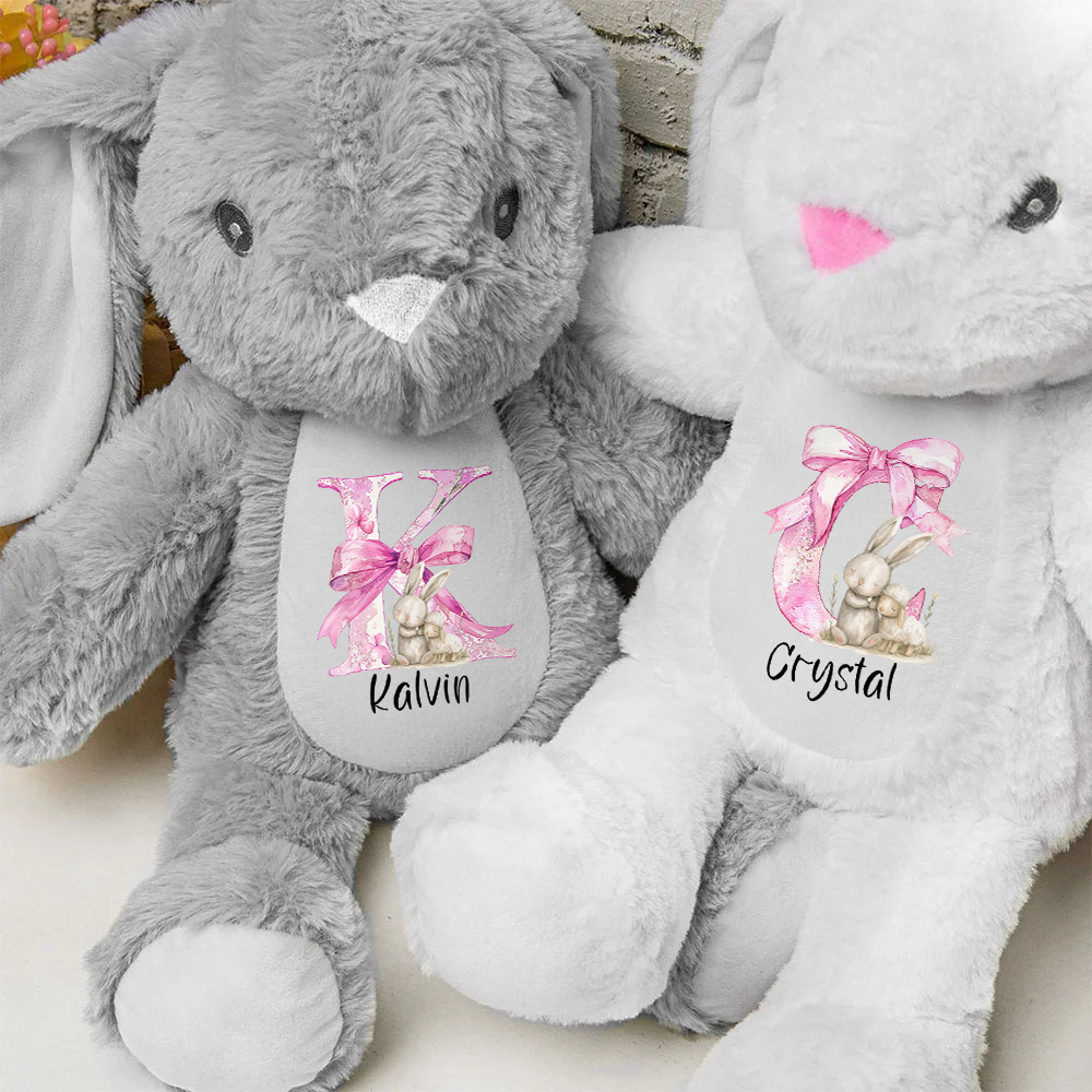 Adorable conejito : el conejito de peluche personalizado con lazo rosa y inicial presenta un encantador conejo con un diseño de lazo rosa. Este tierno y tierno juguete de peluche es perfecto para los más pequeños y le agrega un toque de fantasía a cualquier habitación.