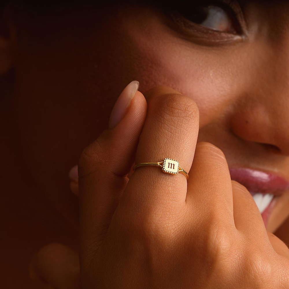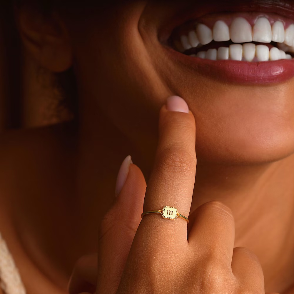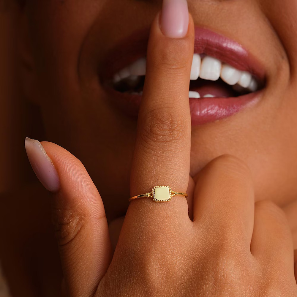 Diseño elegante : Presentamos el anillo de sello personalizado para el meñique, una pieza minimalista que combina a la perfección estilo y sentimiento. Diseñado para mujer, este anillo presenta un acabado elegante con un delicado diseño de sello cuadrado.